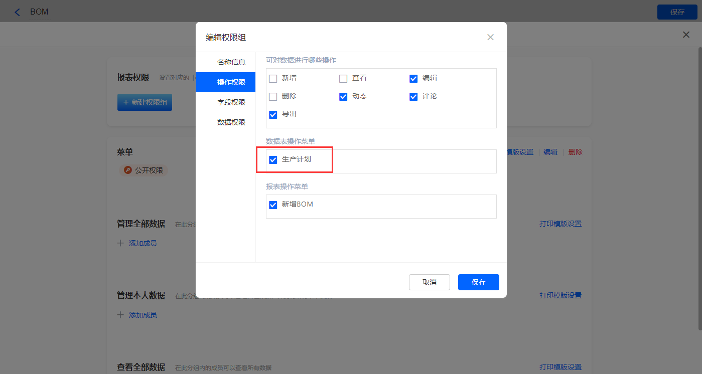 4)设置报表的权限,填入权限组名称,选择可操作的数据表菜单,点击【保存】;