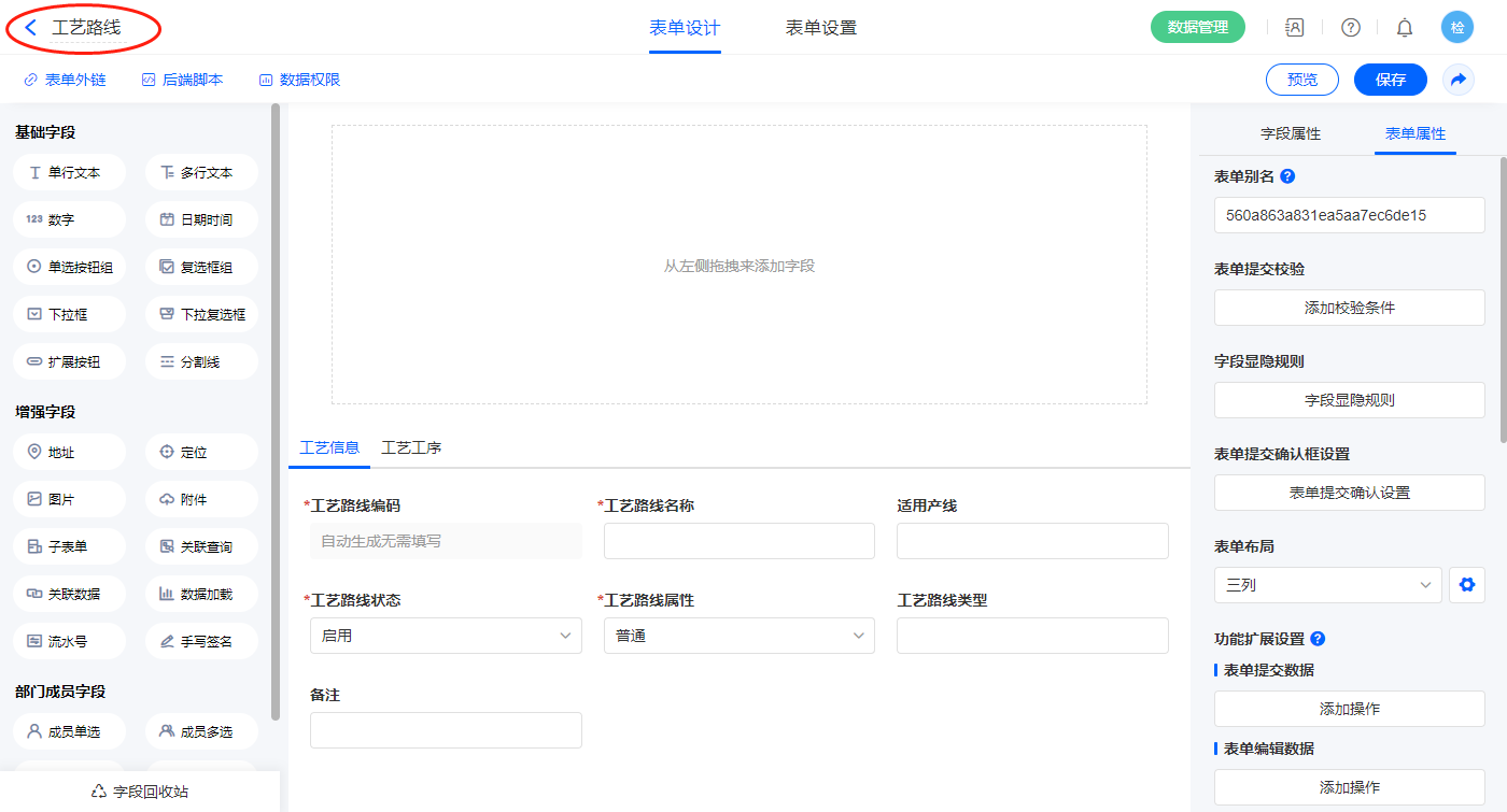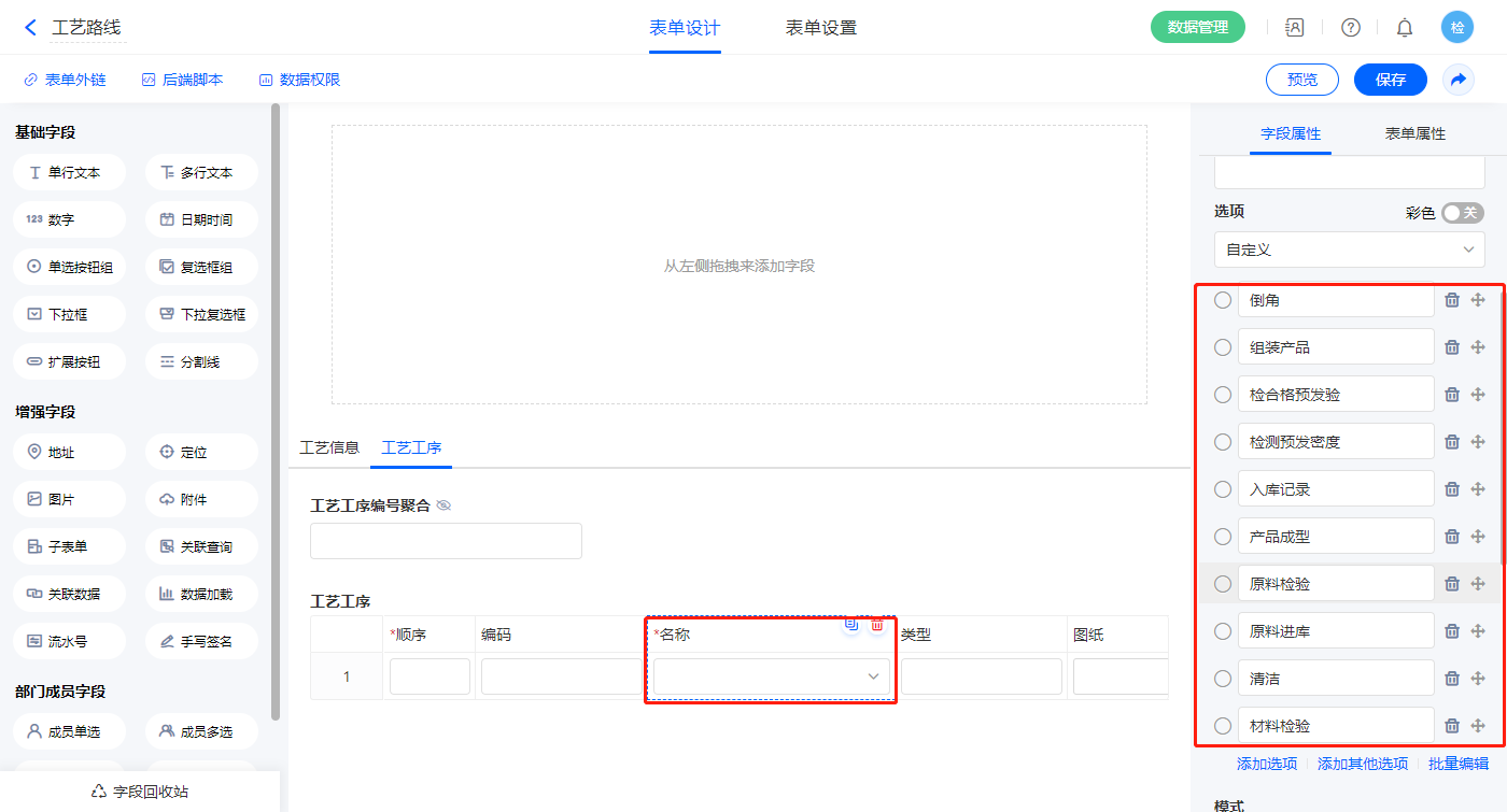 2)【工艺路线状态】、【工艺路线属性】、【工艺工序.名称】字段,输入下拉框选项;
