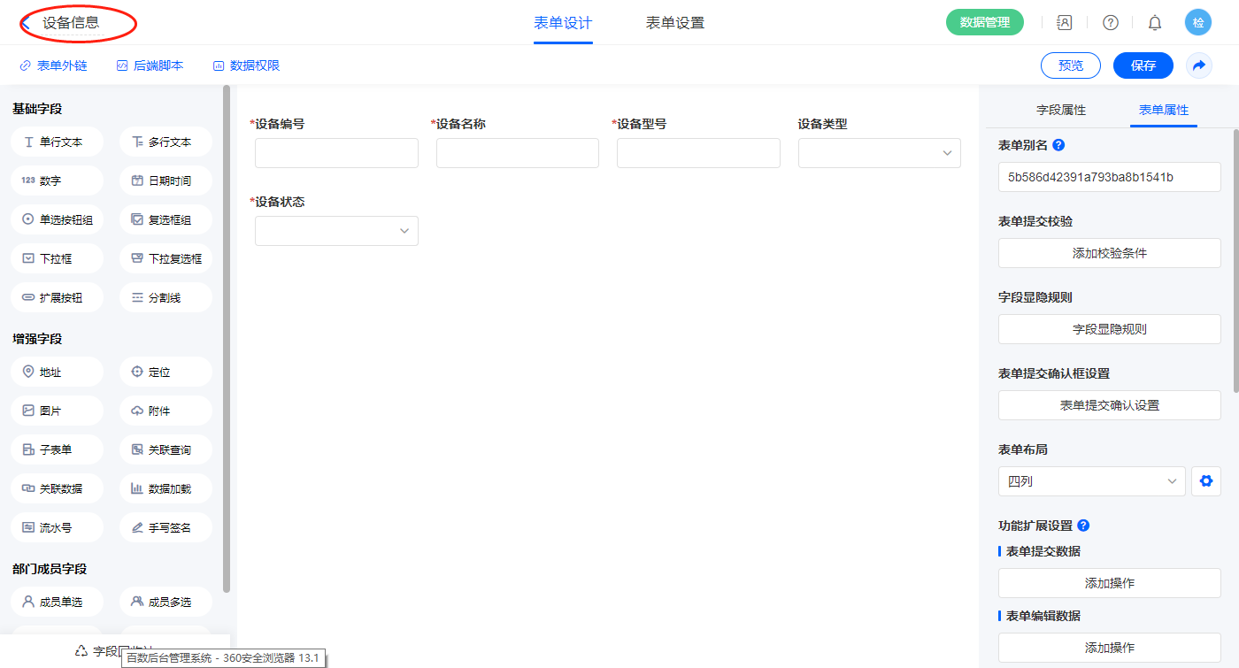 【工序.使用设备】字段,选择设置为关联其他表单数据,关联设备信息的【设备名称】字段;