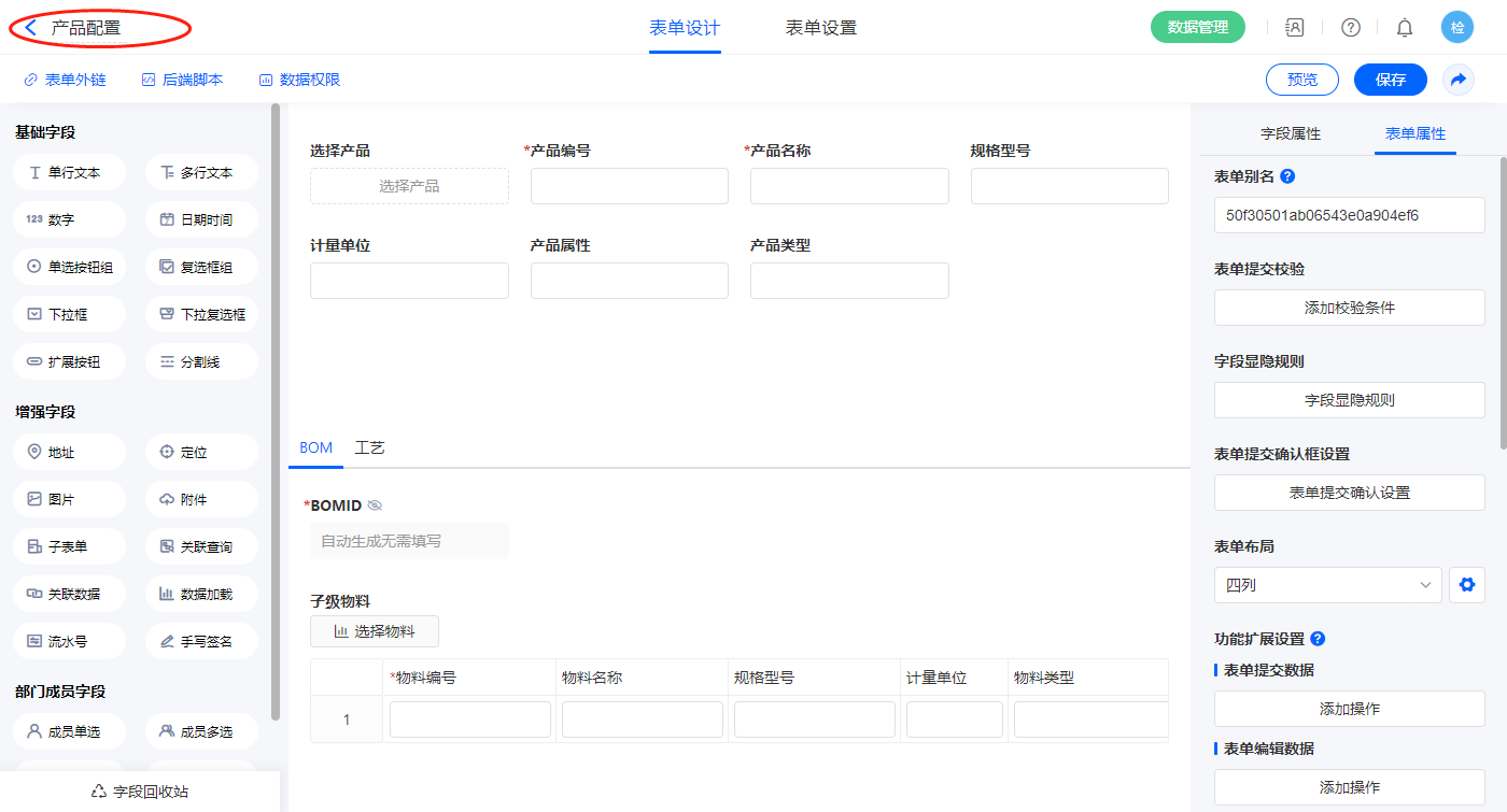 【物料清单】子表单字段,设置默认值为数据联动,关联表及关联条件相同,设置对应的联动字段即可;