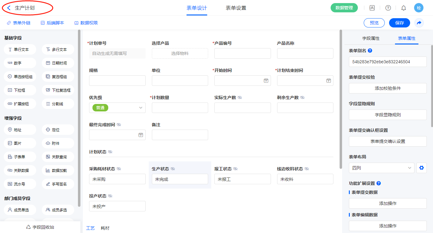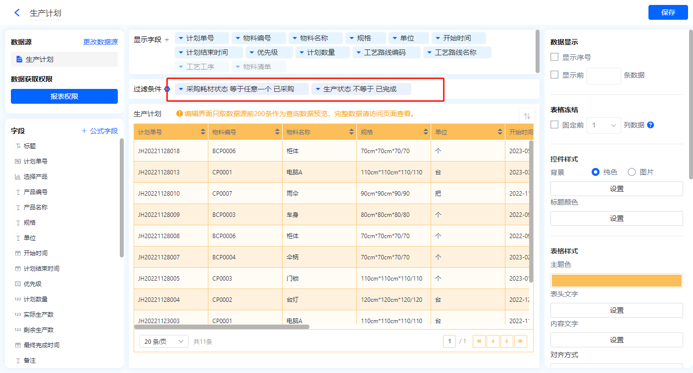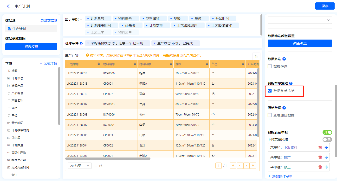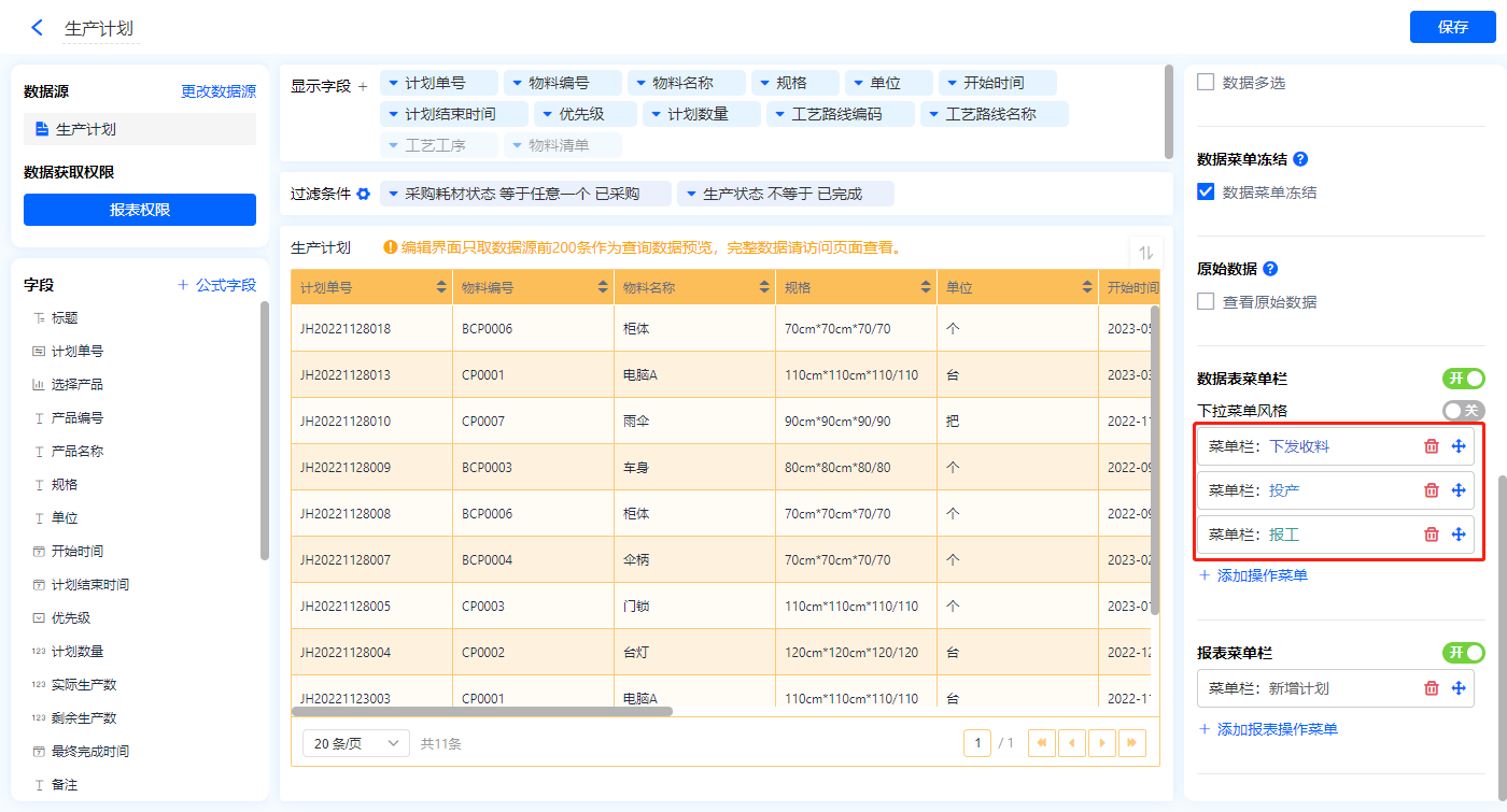 1)新增【生产中计划】报表,用基础报表【数据表】展示数据源为表单【生产计划】的数据;