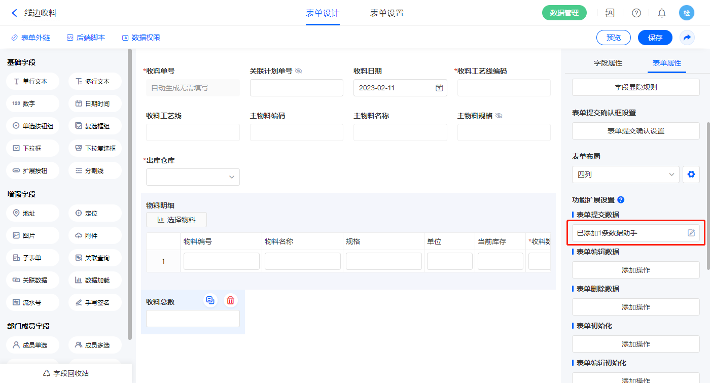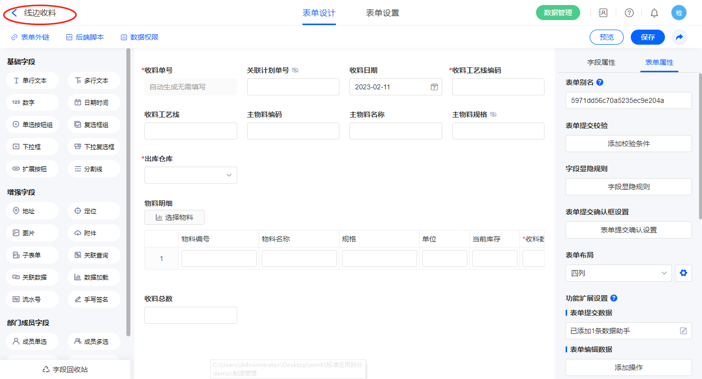 【下发收料】菜单栏,操作模式设置为弹出表单【线边收料】;