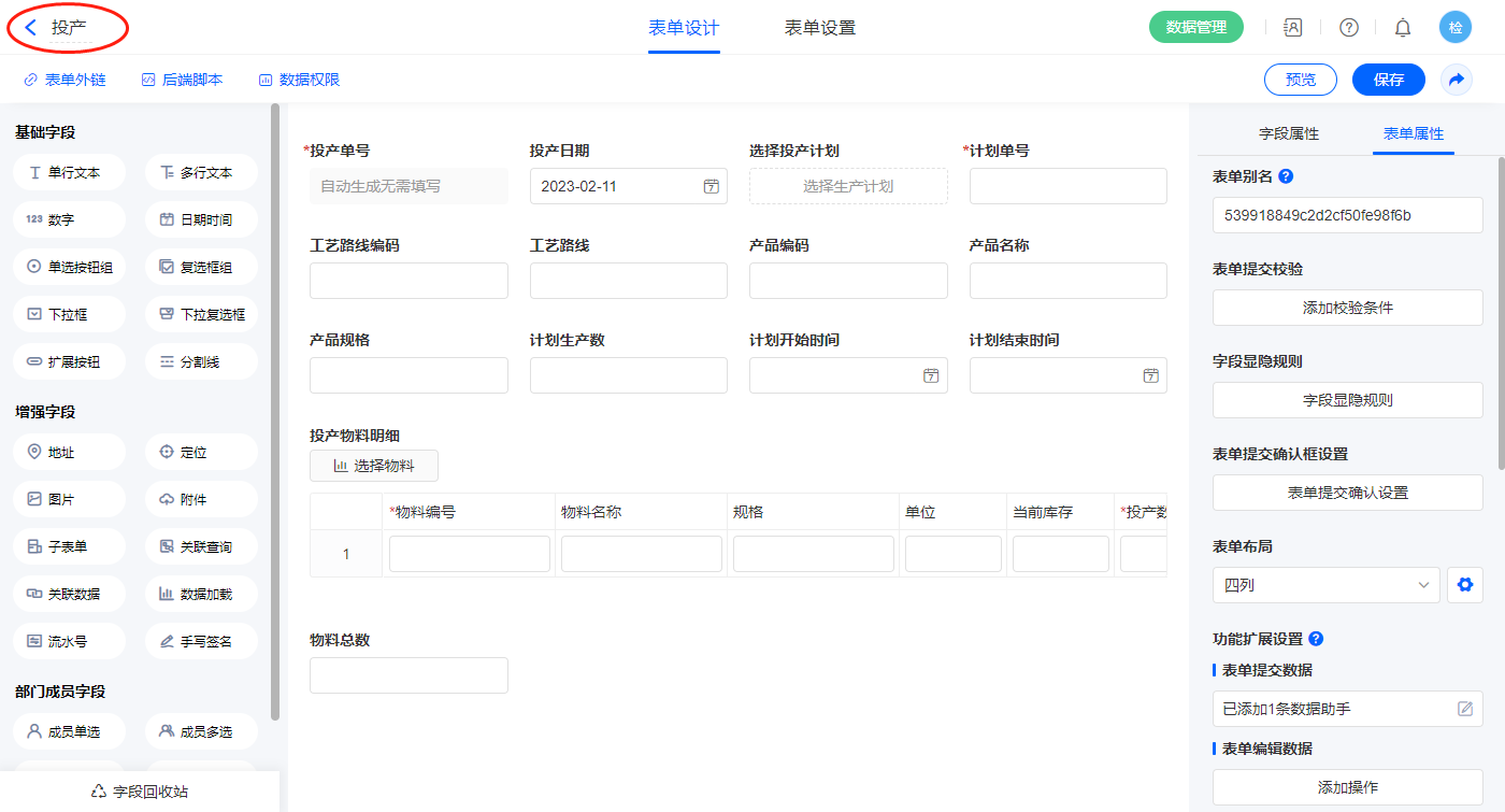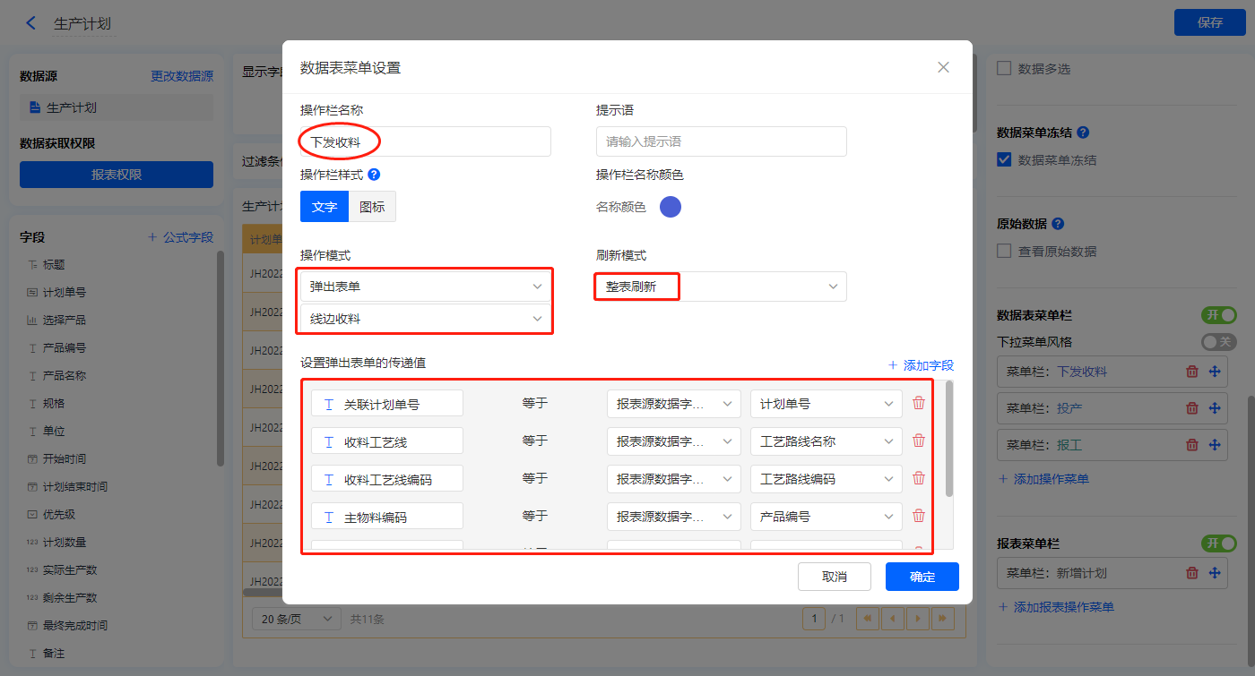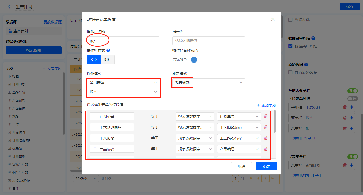 【投产】菜单栏,操作模式设置为弹出表单【投产】;