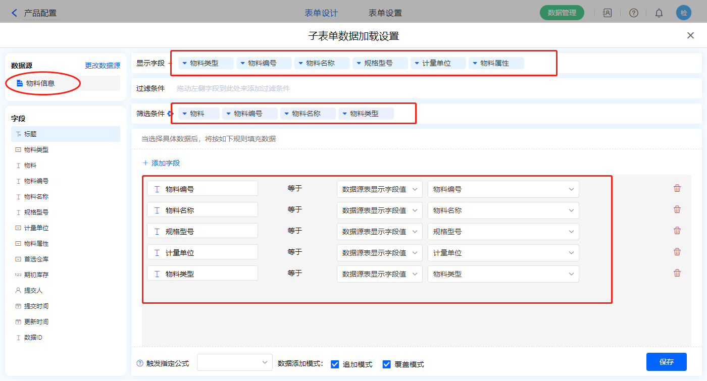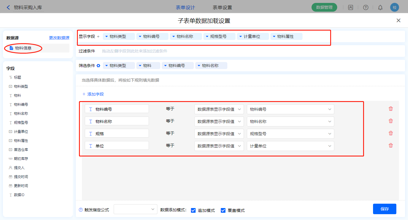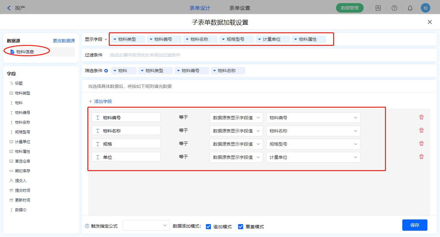 1)【物料明细】子表单开启数据加载,数据源为【物料信息】,添加显示字段设置赋值字段及筛选条件,点击保存;
