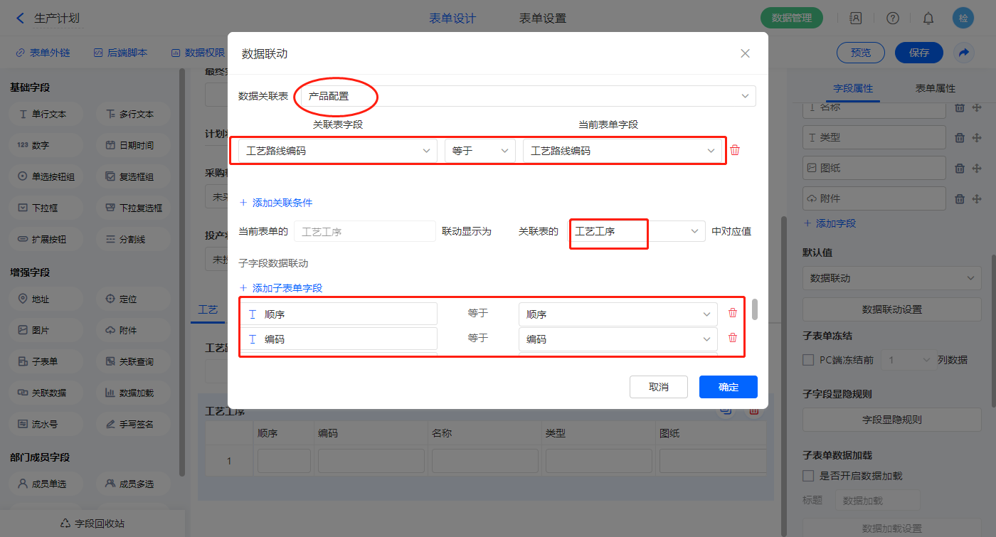 2)【工艺工序】子表单字段,设置默认值为数据联动,关联表及关联条件相同,设置对应的联动字段即可;