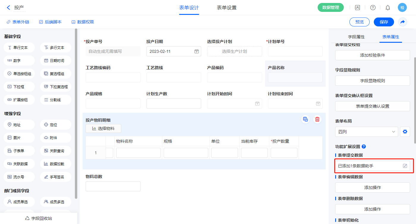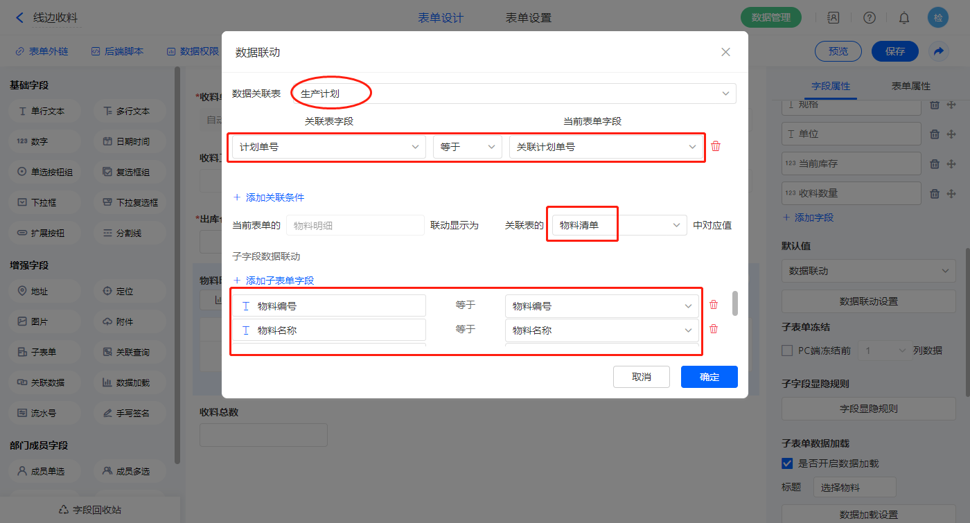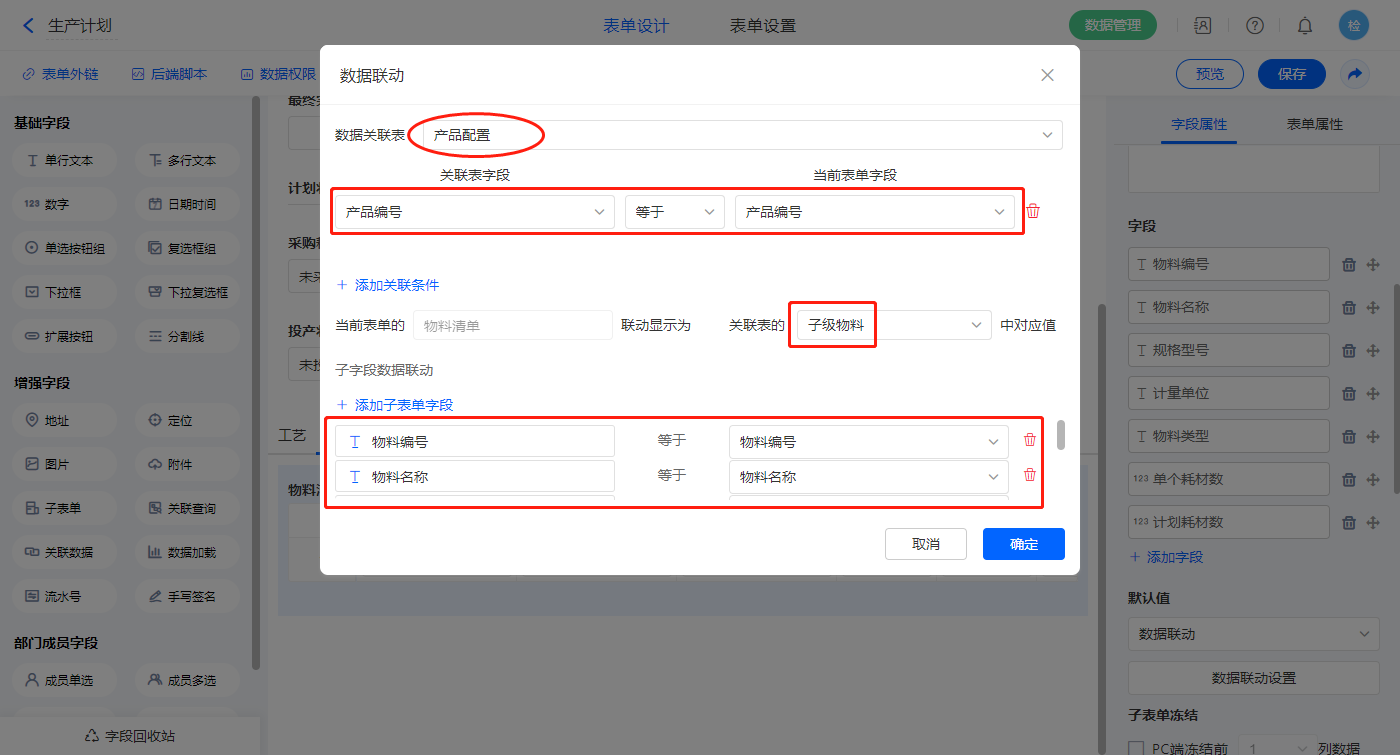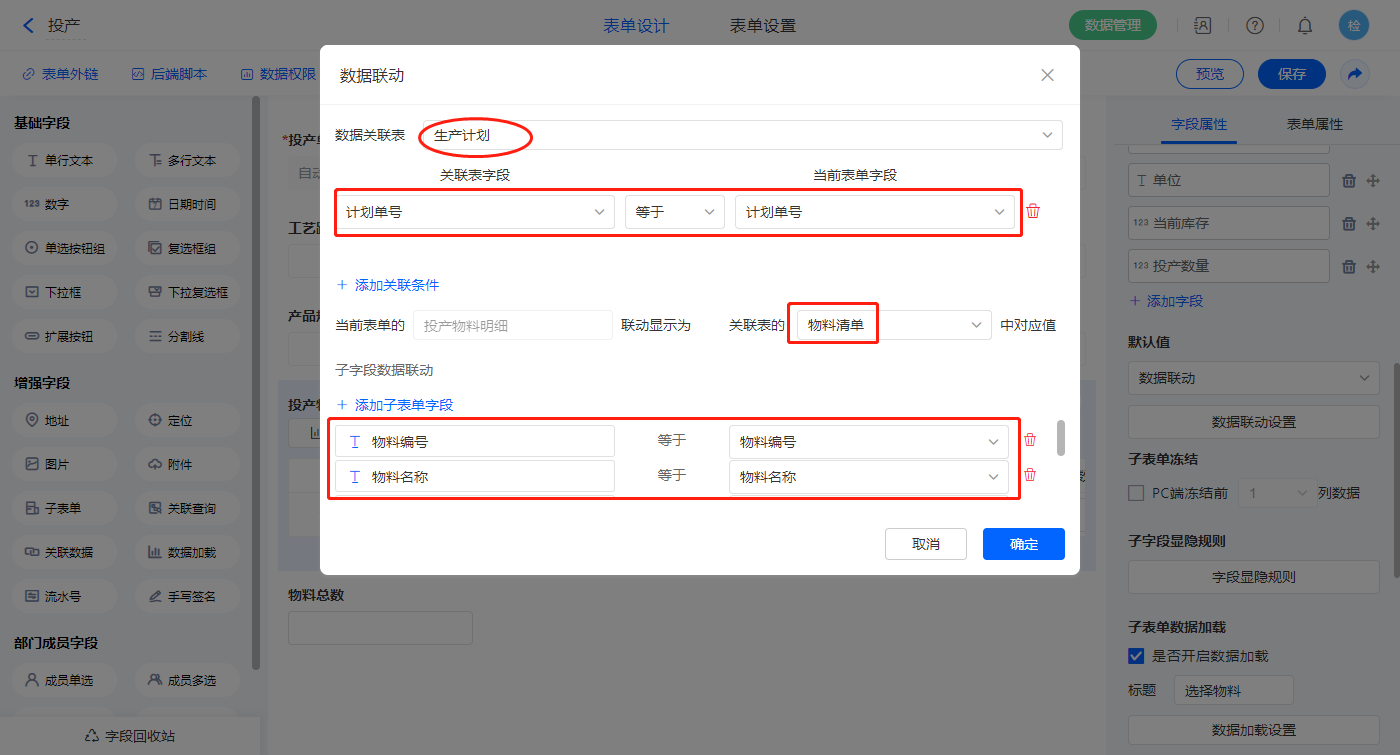 【投产物料明细】子表单字段,设置默认值为数据联动,设置联动条件及联动字段;