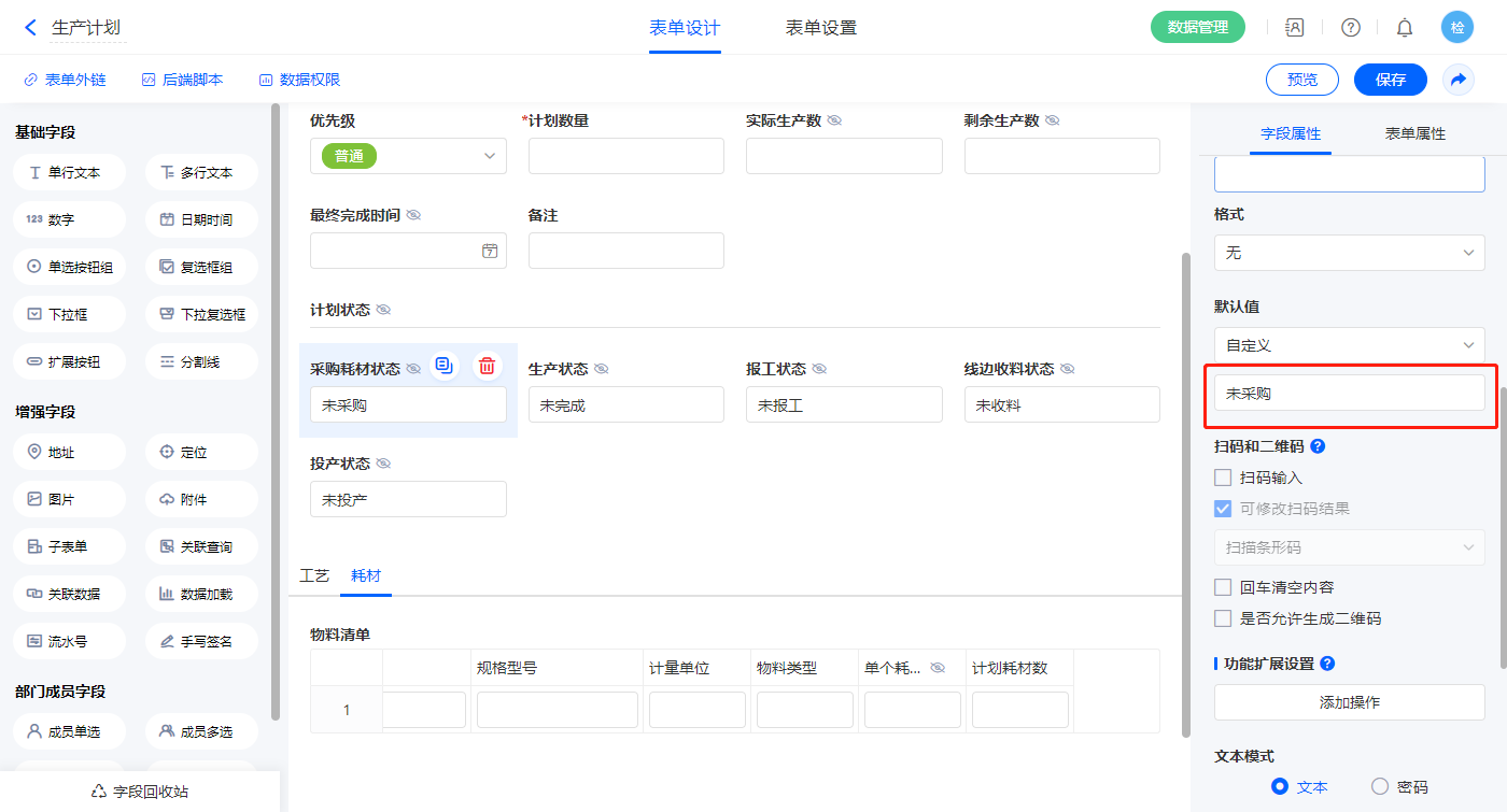 3)【采购耗材状态】、【生产状态】、【报工状态】、【线边收料状态】、【投产状态】分别设置默认值为:“未采购”、“未完成”、“未报工”、“未收料”、“未投产”;