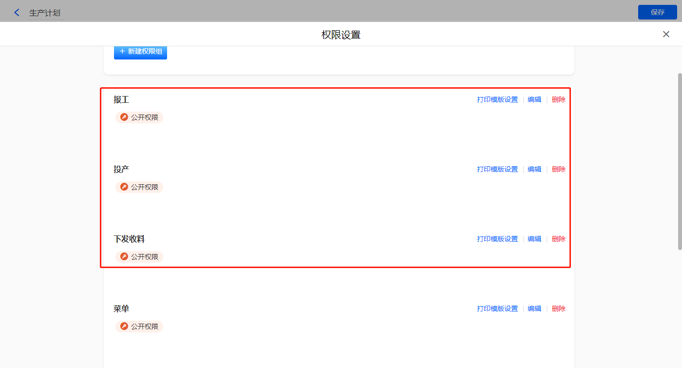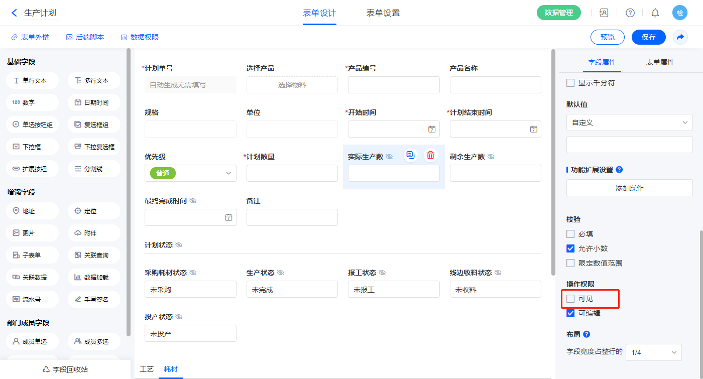 4)【实际生产数】、【剩余生产数】、【最终完成时间】、【采购耗材状态】、【生产状态】、【报工状态】、【线边收料状态】、【投产状态】、【物料清单.单个耗材数】设置操作权限为不可见;