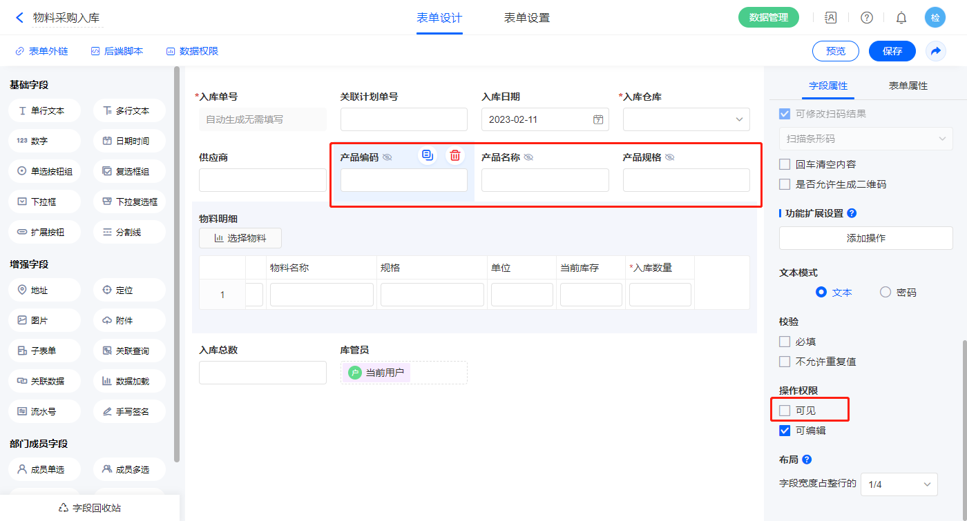 3)【产品编码】、【产品名称】、【产品规格】以上字段设置操作权限为不可见;