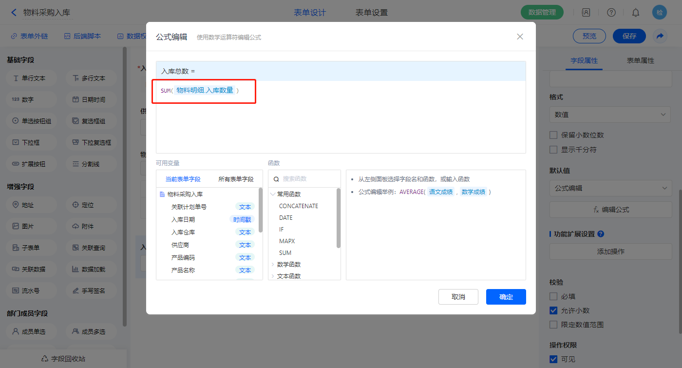 5)【收料总数】字段,设置默认值为公式编辑,如图设置公式;