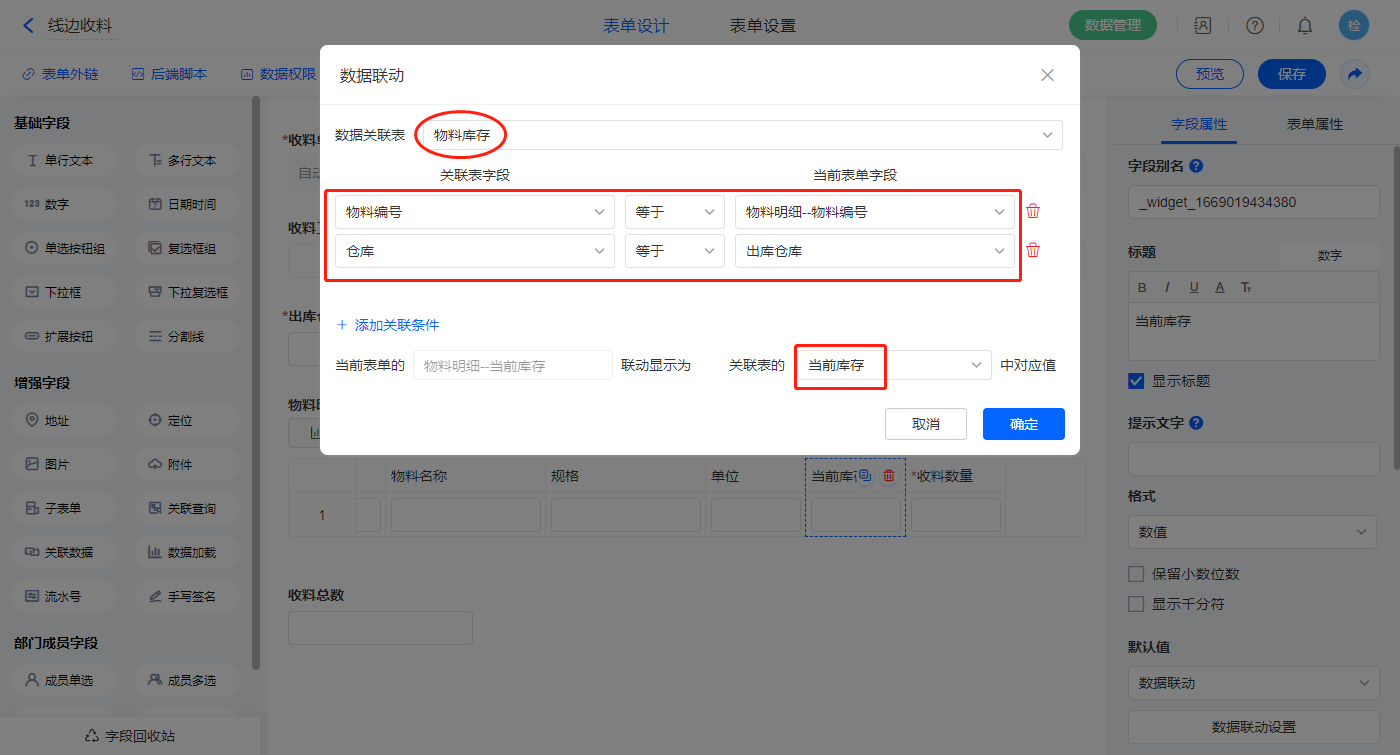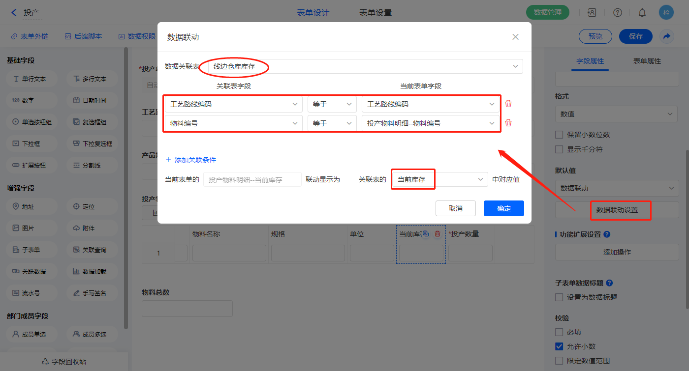 【物料明细.当前库存】字段,设置默认值为数据联动,设置联动条件及联动字段;