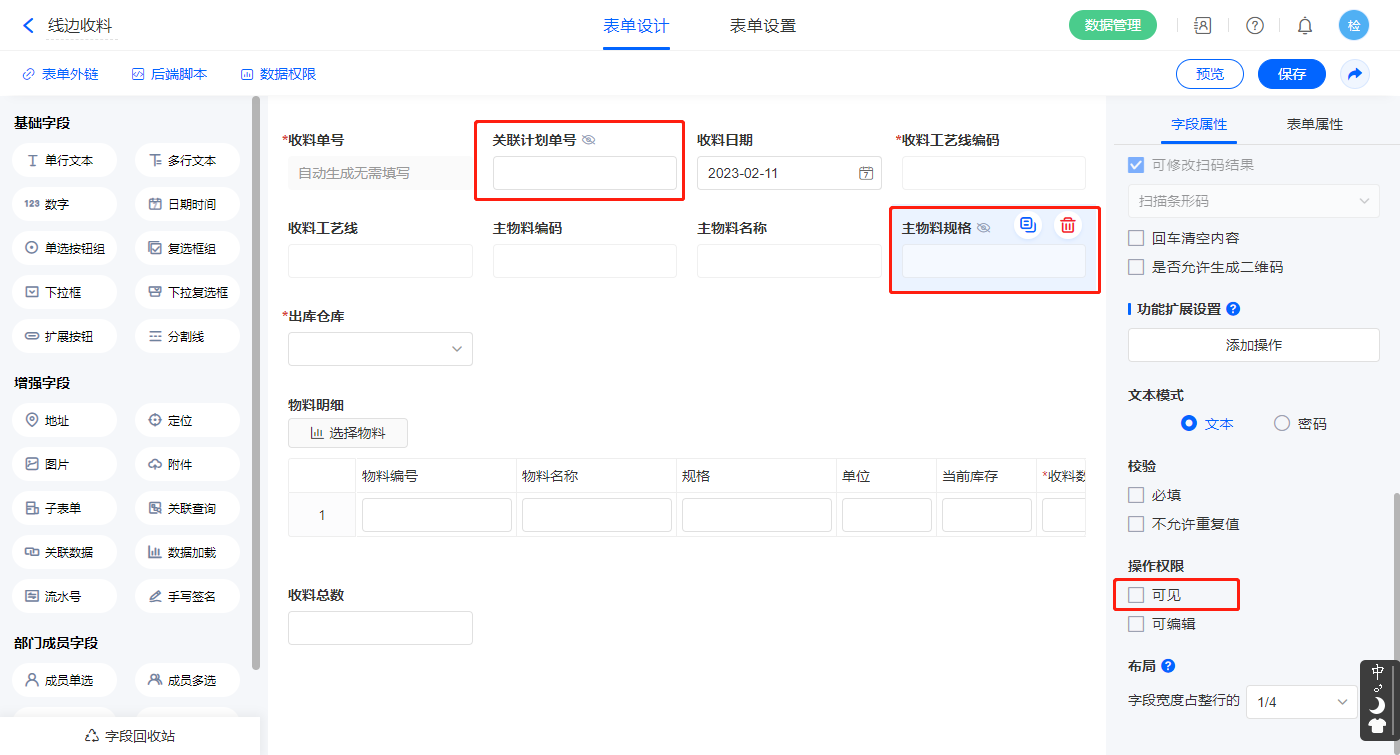 4)【关联计划单号】、【主物料规格】字段设置操作权限为不可见;