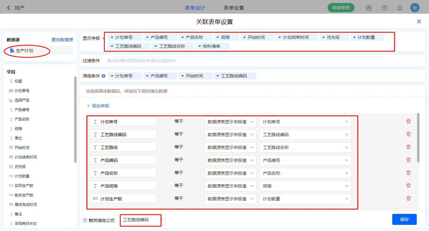 1)【选择投产计划】数据加载字段,数据源为【生产计划】,添加显示字段设置赋值字段及筛选条件,触发指定公式为【工艺路线编码】字段,设置完点击保存;