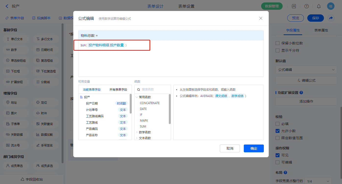 5)【物料总数】字段,设置默认值为公式编辑,如图设置公式;