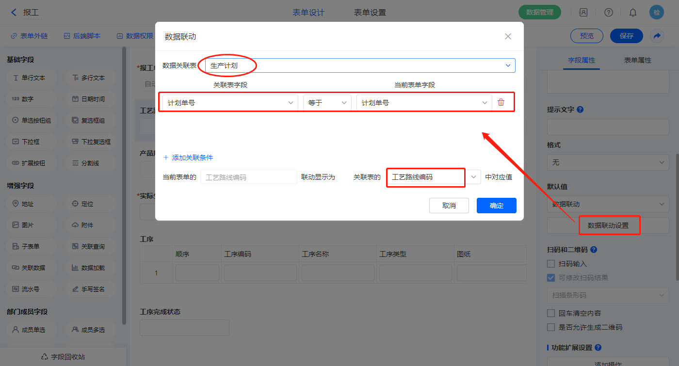 2)【工艺路线编码】、【工艺路线】、【计划生产数】设置默认值为数据联动,关联表及关联条件相同,设置对应的联动字段即可;