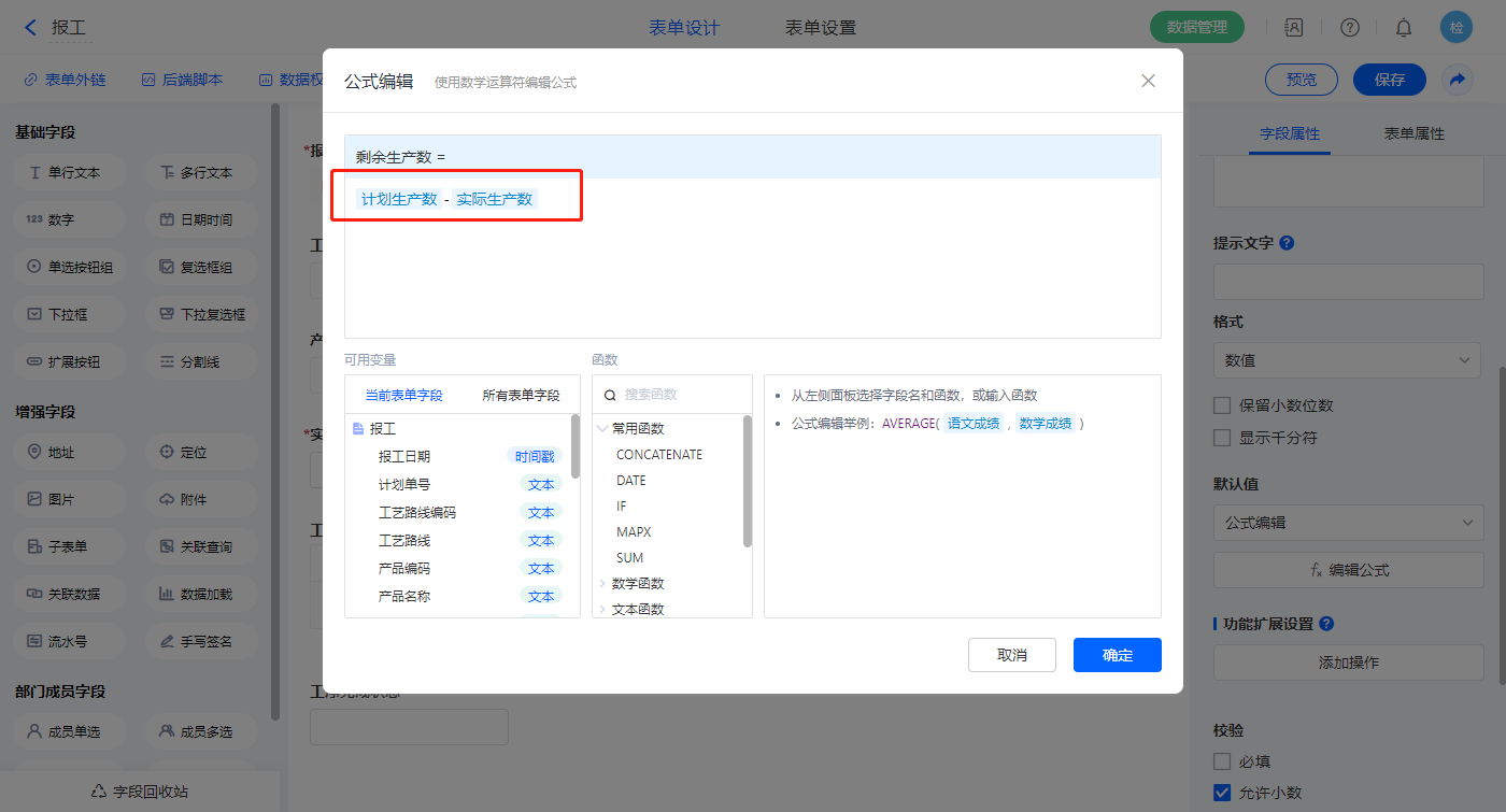 3)【剩余生产数】字段,设置默认值为公式编辑,如图设置公式;该字段为不可见;