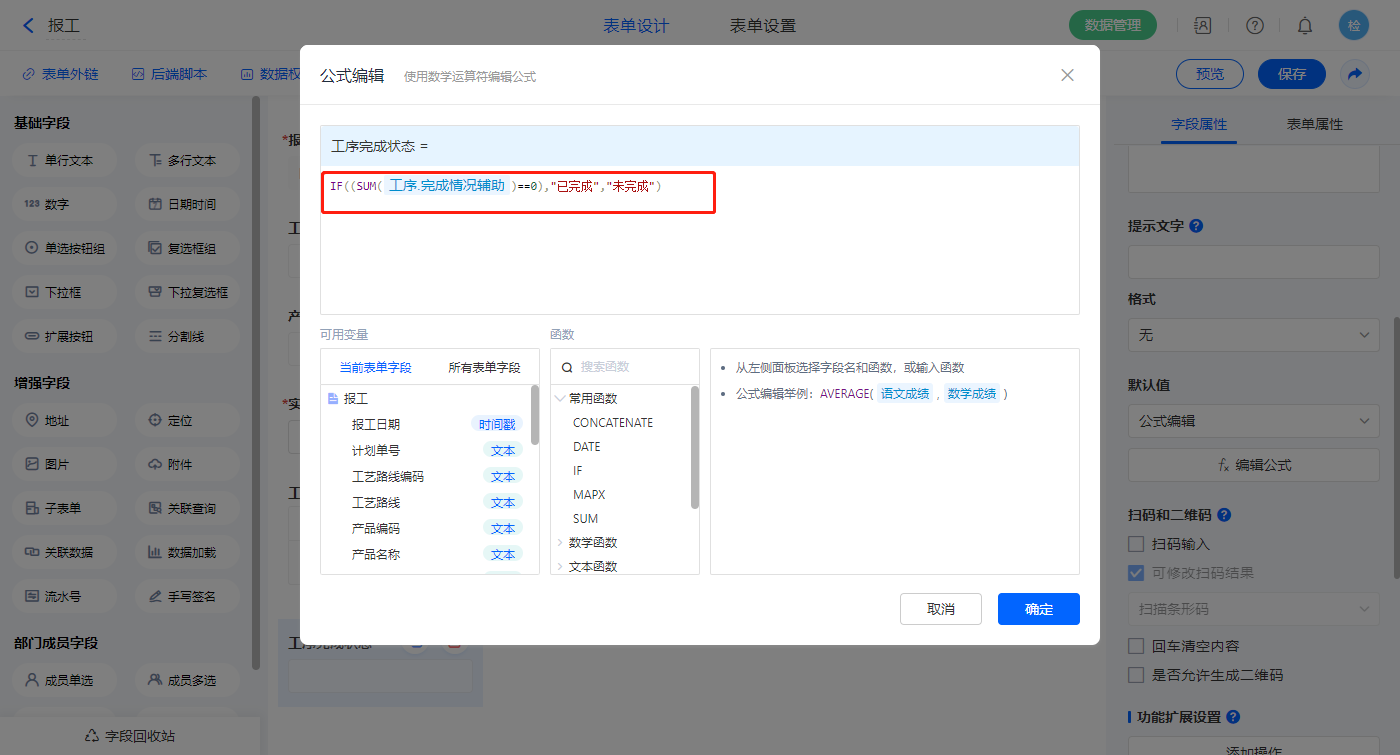 【工序完成状态】字段,设置默认值为公式编辑,设置公式:“IF((SUM(工序.完成情况辅助)==0),"已完成","未完成")”;