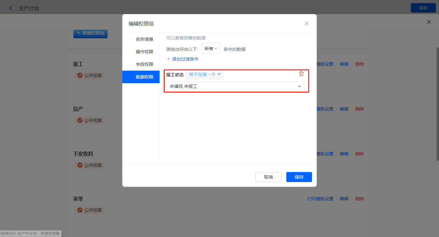 报工数据权限添加过滤条件,【报工状态】等于未填写,未报工;
