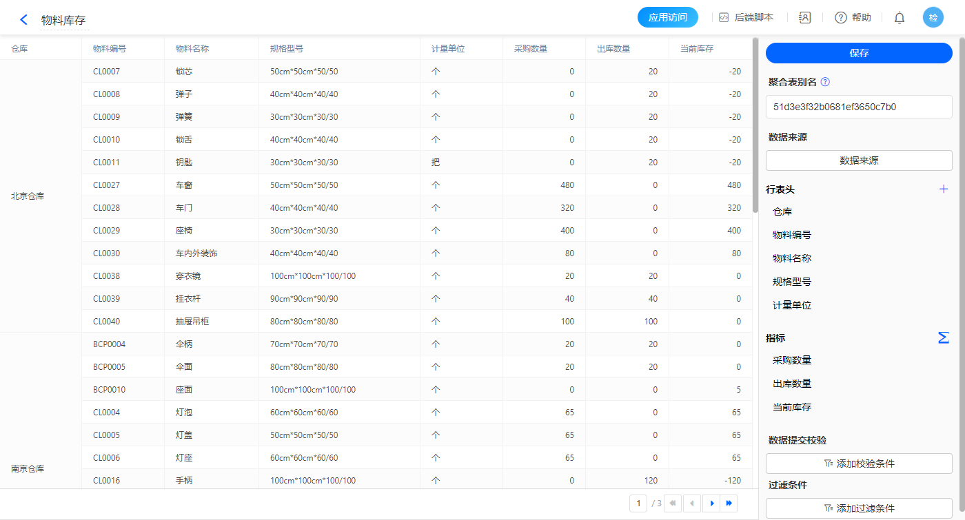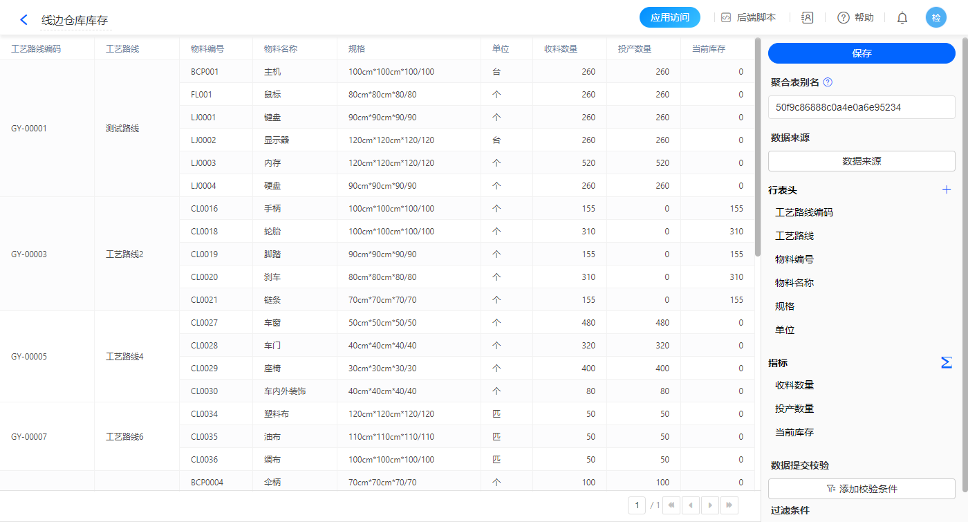 1)该应用运用到两个聚合表【线边仓库库存】、【物料库存】;
