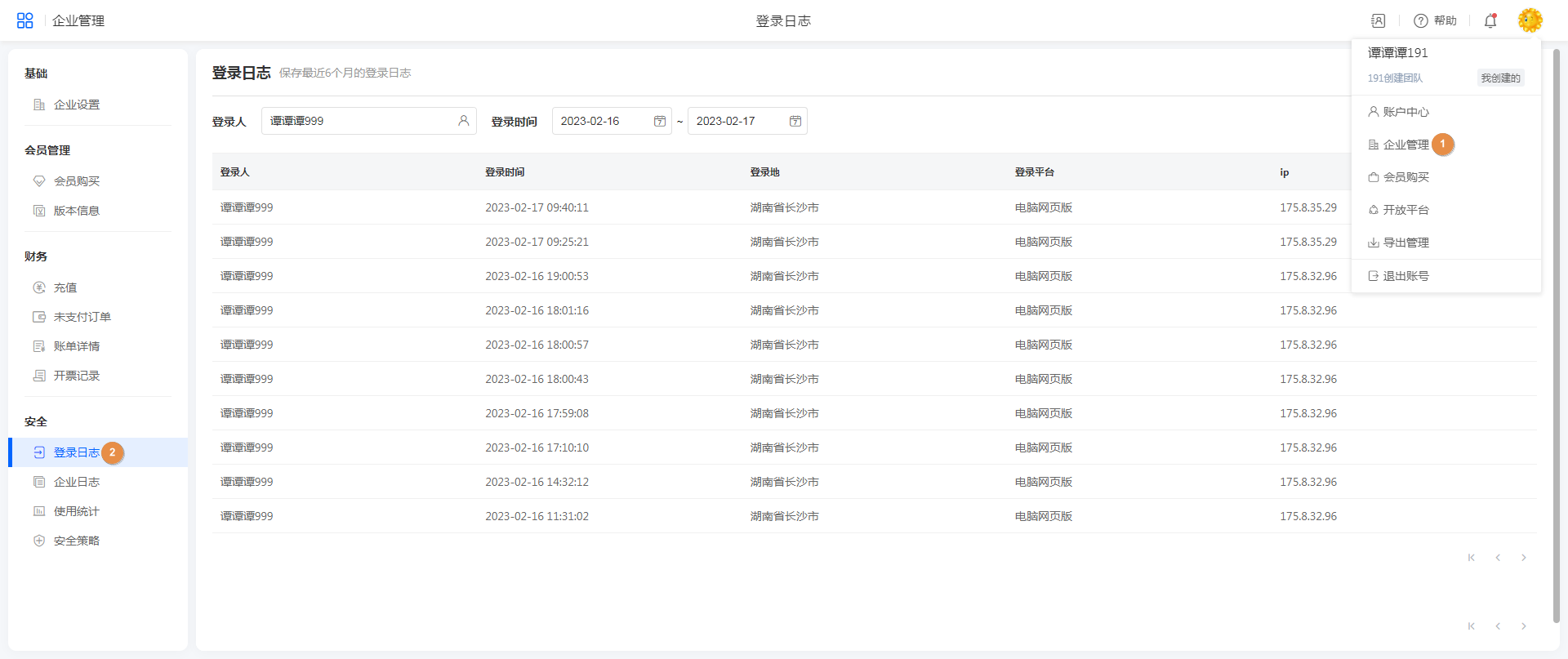 • 系统管理员可以查看到团队所有成员的登录日志,成员只能查看到自己的登录日志。