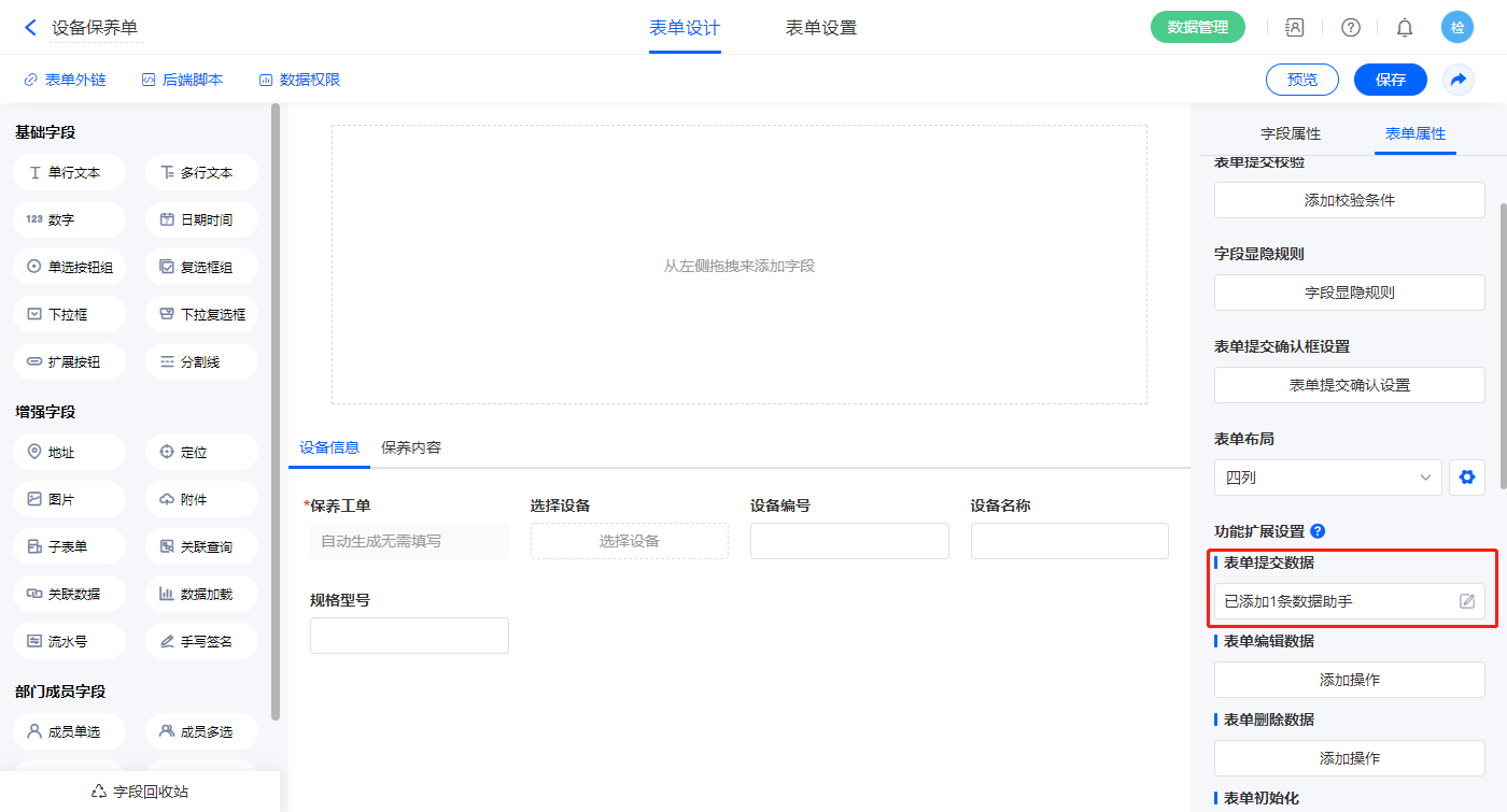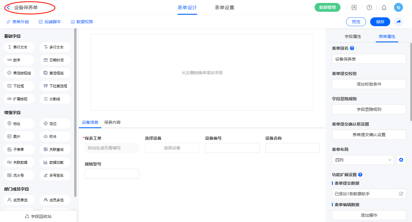 2.3、表单【设备保养单】字段及表单属性设置