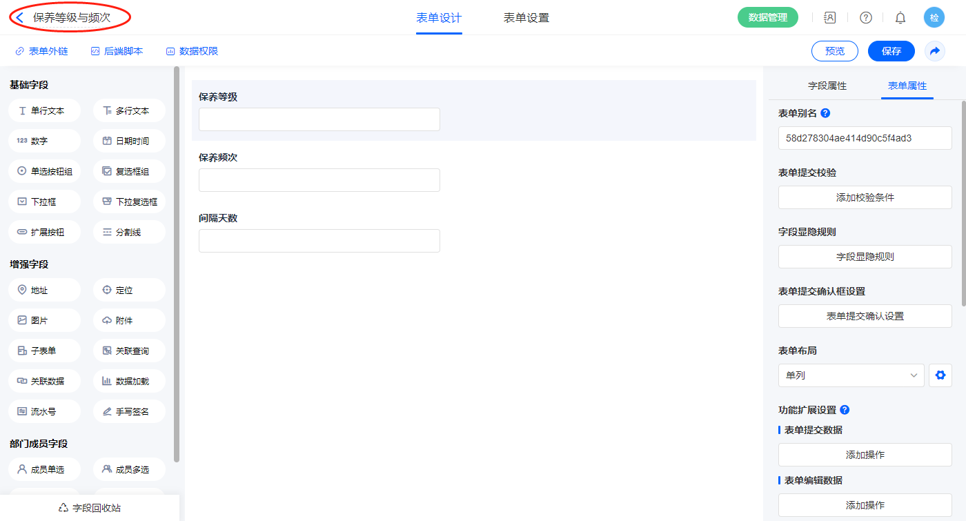 2)【保养等级】字段,选择设置为关联其他表单数据,关联保养等级与频次的【保养等级】字段;