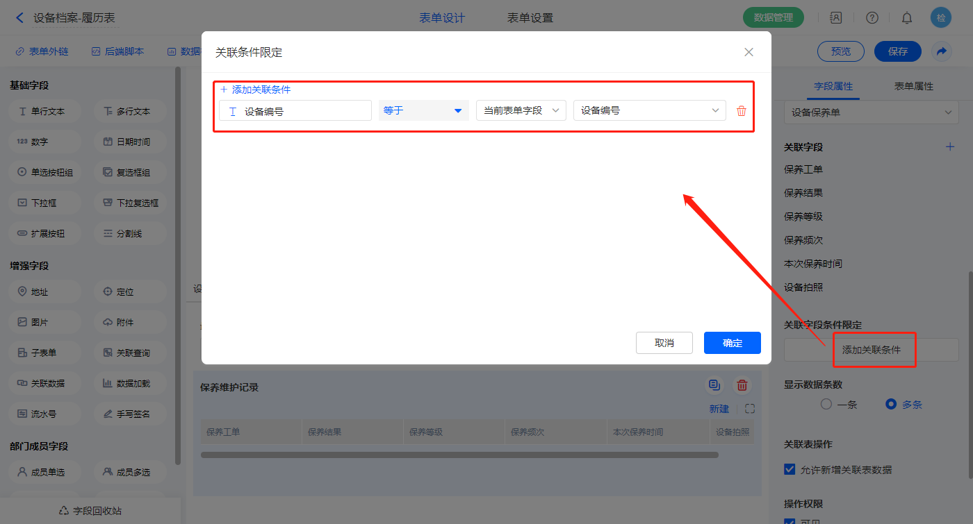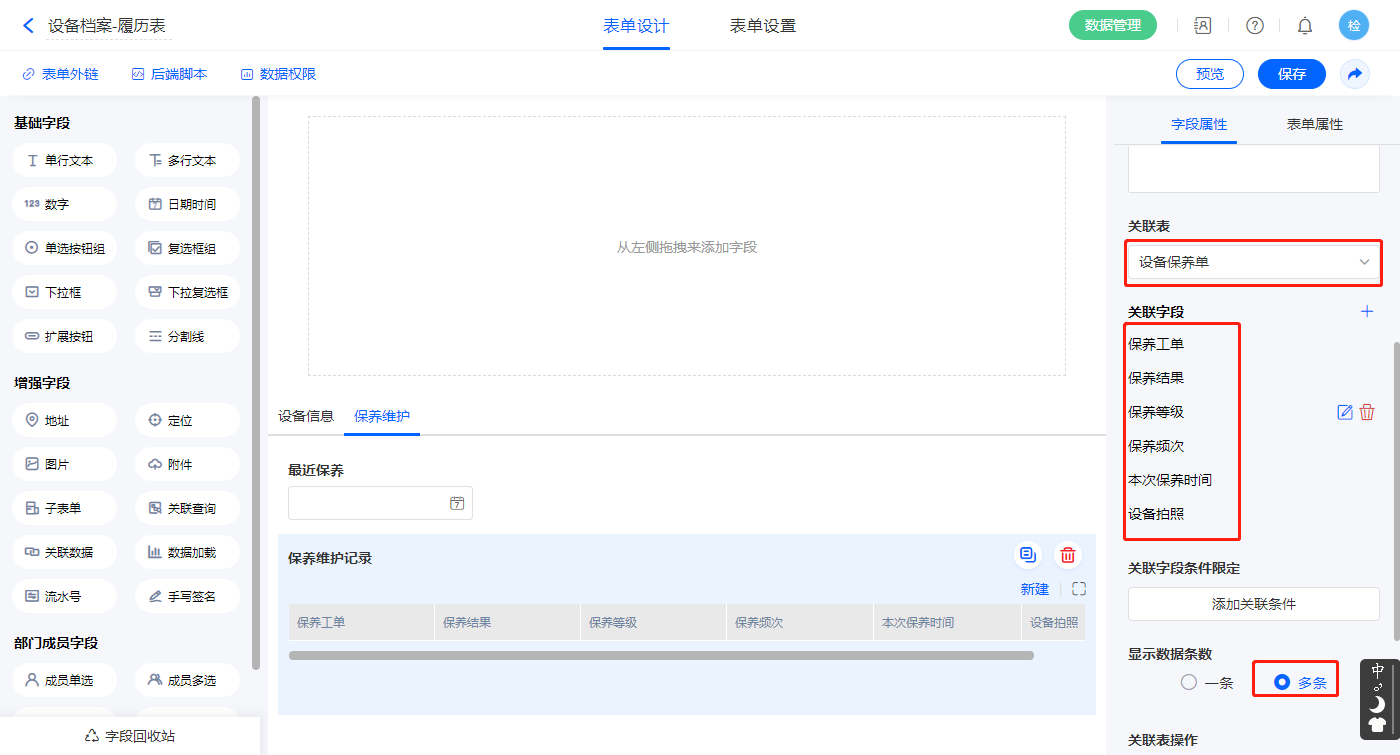 1)【保养维护记录】关联查询字段,设置关联表为【设备保养单】并如图选择关联字段,设置显示数据条数为多条;