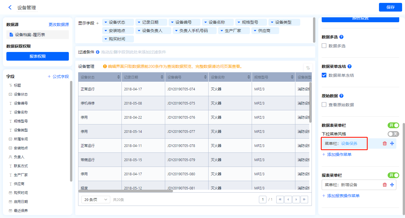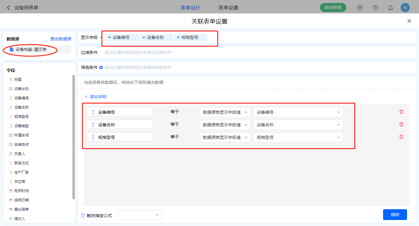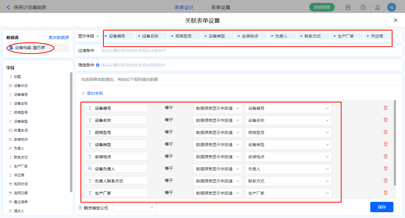 1)【选择设备】数据加载字段,数据源为【设备档案-履历表】,添加显示字段设置赋值字段,点击保存;