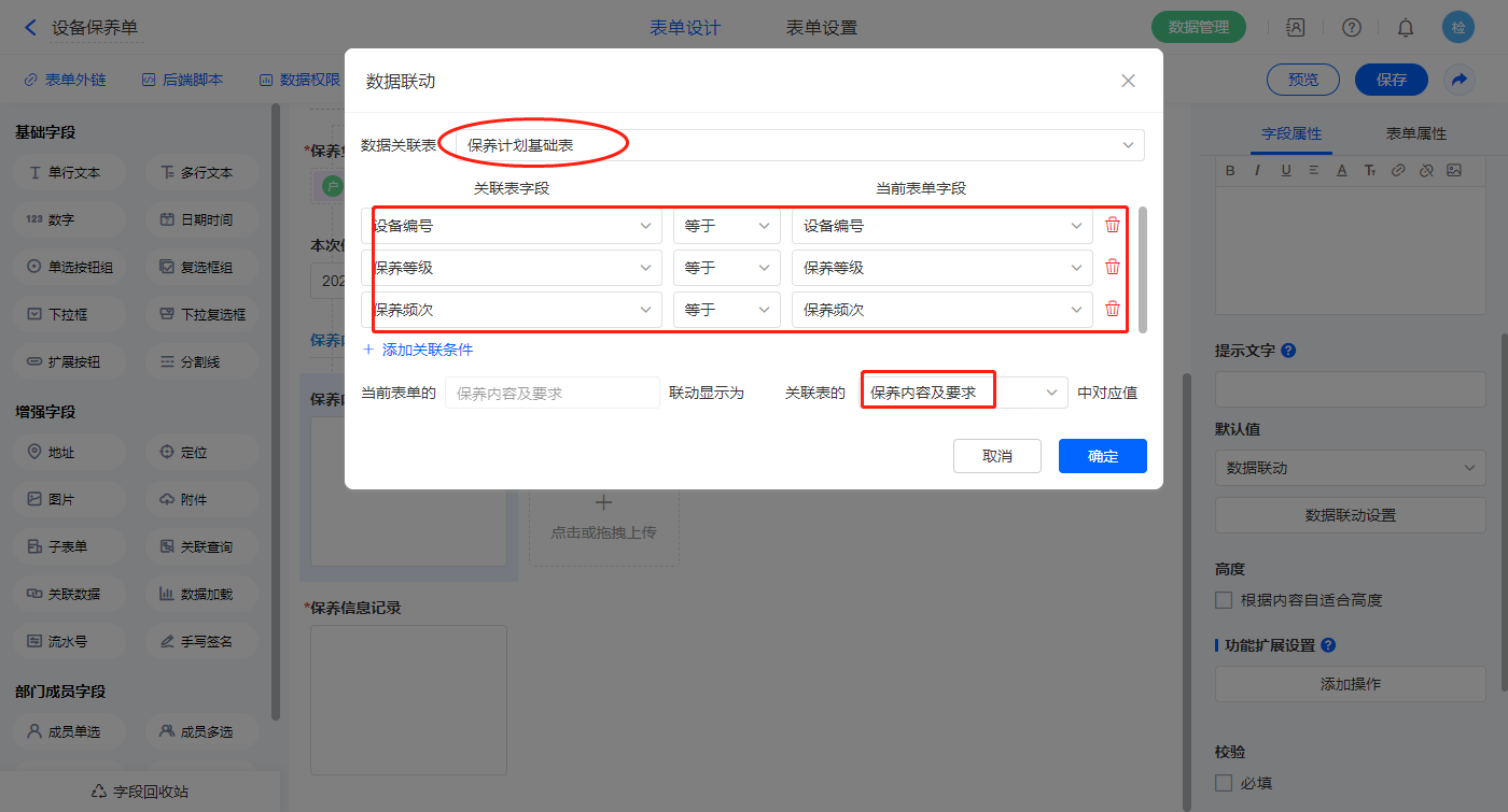 【保养内容及要求】字段,设置默认值为数据联动,设置联动条件及联动字段;
