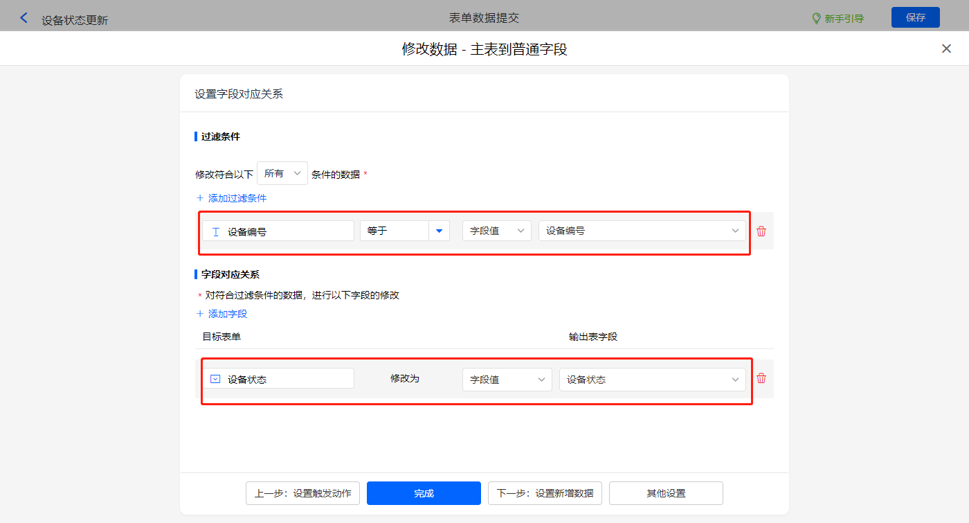 新增修改数据的执行动作,选择目标表单【设备档案-履历表】,配置过滤条件及对应赋值字段,设置好点击【完成】并保存该数据助手;