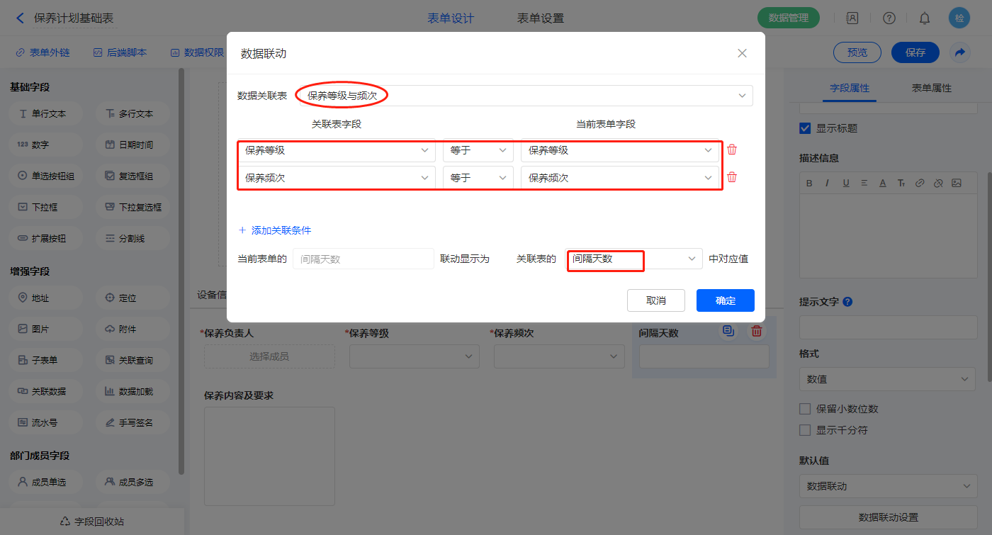 2)【保养等级】、【保养频次】、【间隔天数】字段,设置默认值为数据联动,联动的表单及条件一致,设置对应联动字段即可;
