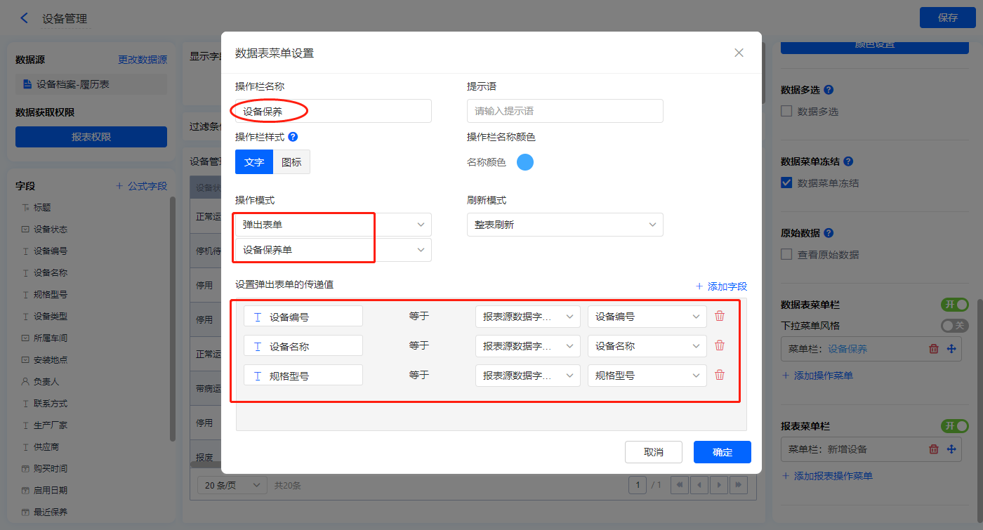 【设备保养】的菜单栏,操作模式设置为弹出表单【设备保养单】;