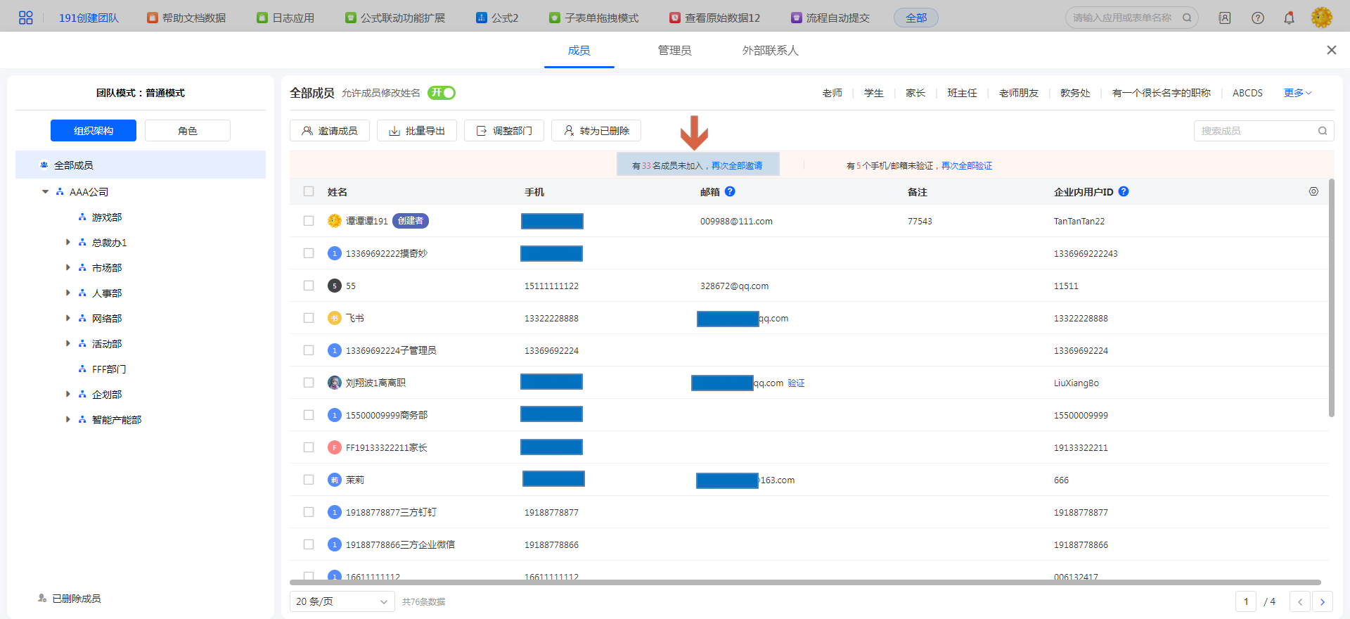 批量导入成员后会通过文件内的手机号给成员发送验证信息,如手机号码错误将无法完成验证步骤;私有云可通过后台设置批量导入免审相关规则。