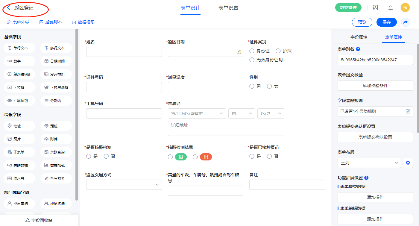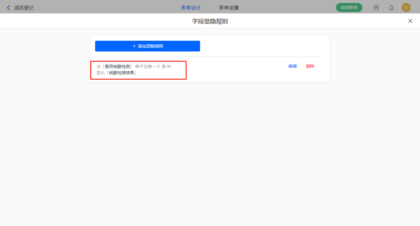 1)设置显隐规则,当【是否核酸检测】字段等于是显示【核酸检测结果】字段;