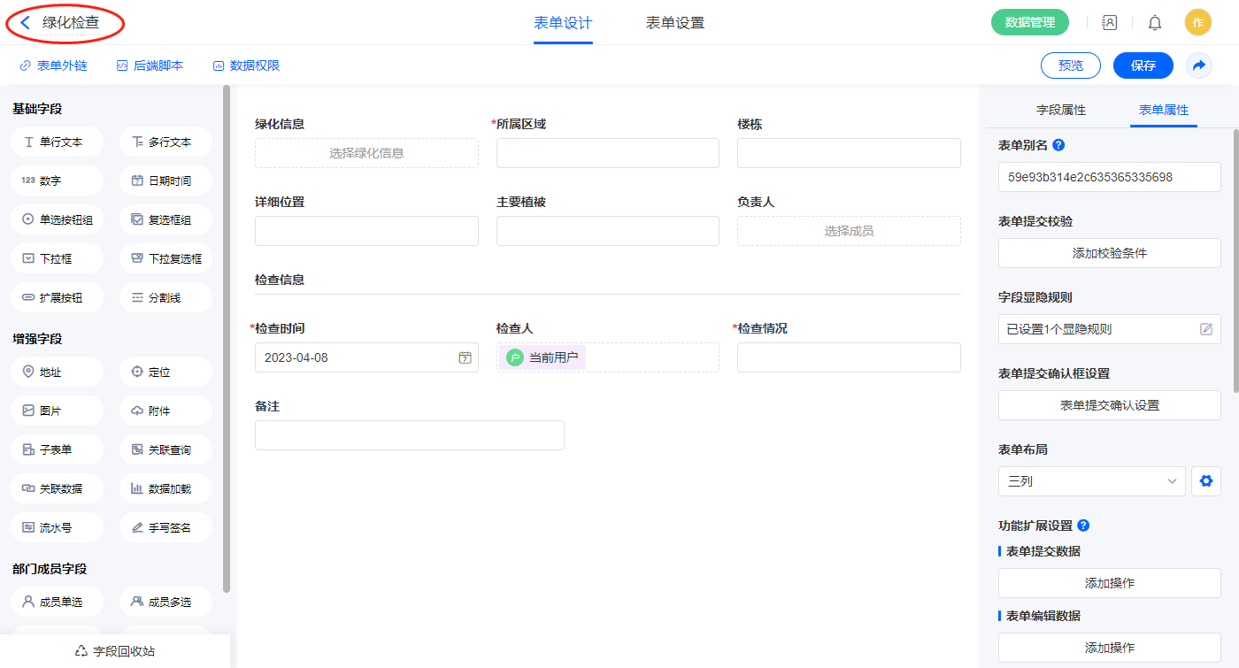 • 2.4、表单【绿化检查】字段及表单属性设置