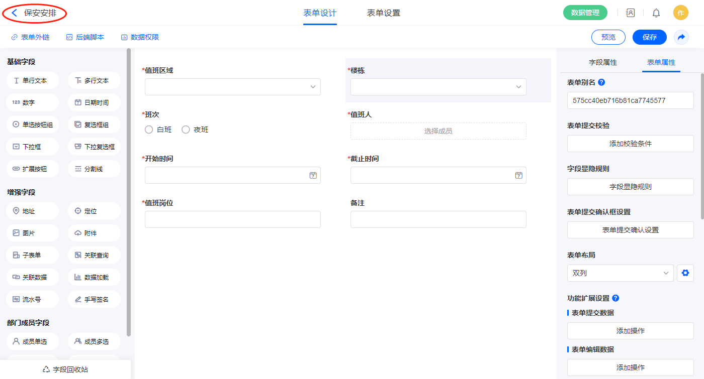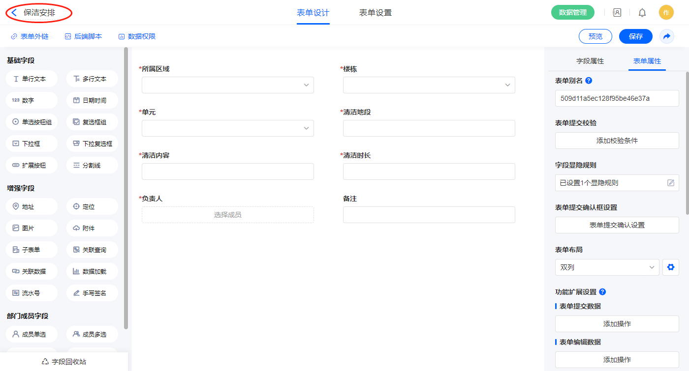 • 2.5、表单【保洁安排】字段及表单属性设置