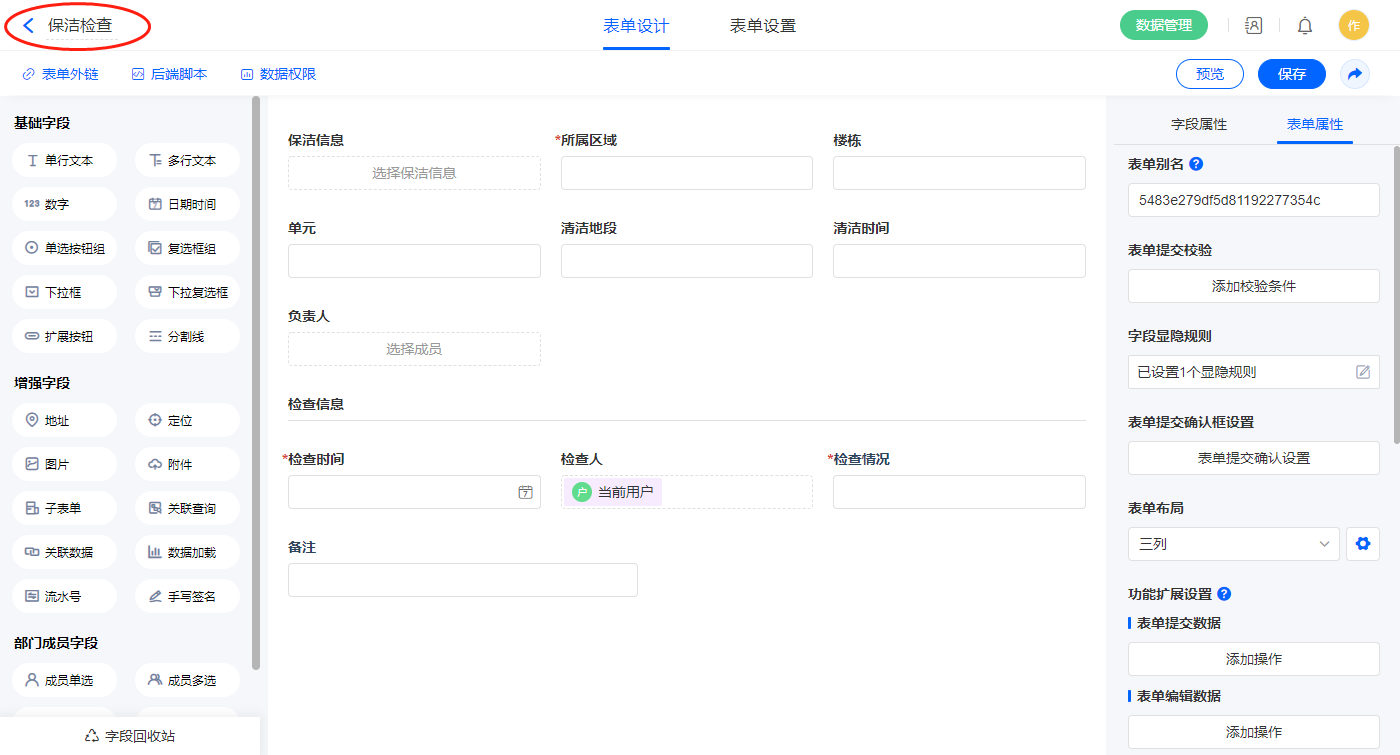 • 2.6、表单【保洁检查】字段及表单属性设置