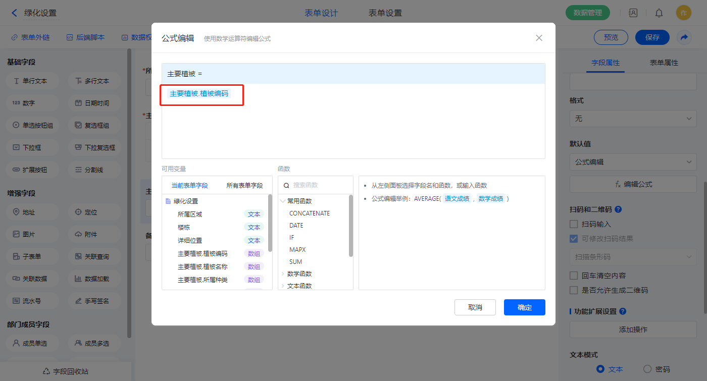 1)【主要植被】字段,默认值选择公式编辑,如图设置公式,并设置为不可见;