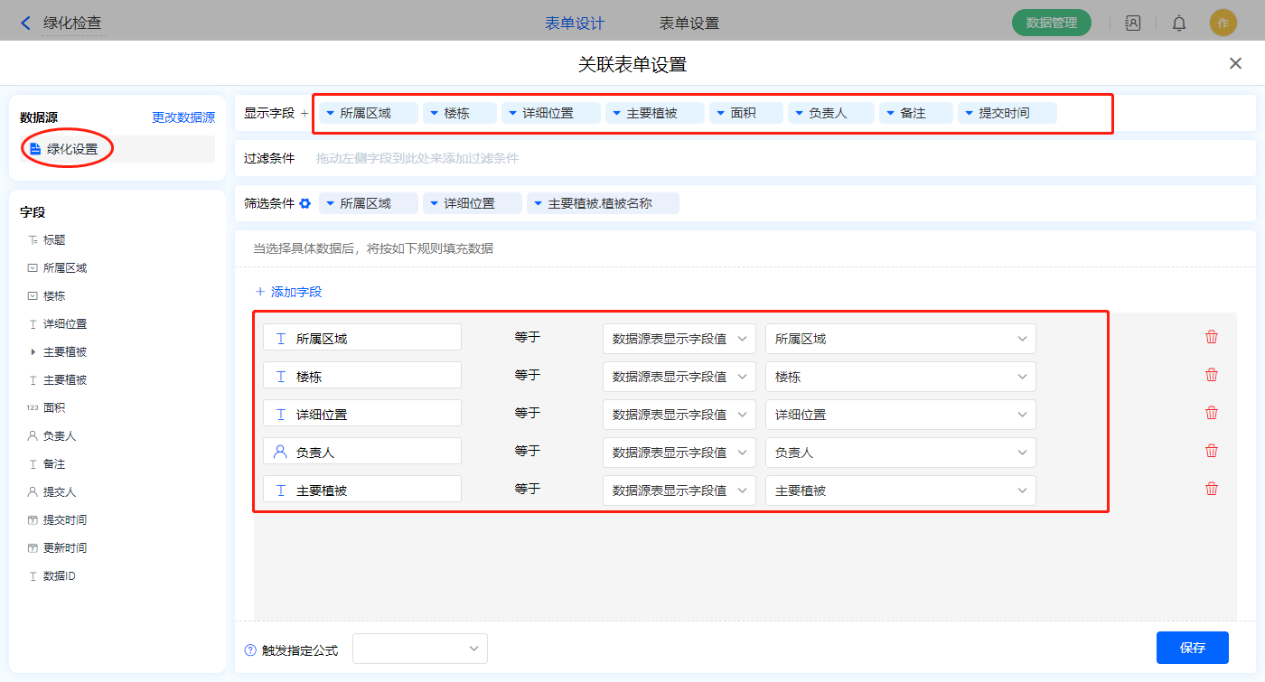 1)【绿化信息】数据加载字段,数据源为【绿化设置】,添加过滤条件及设置赋值字段;