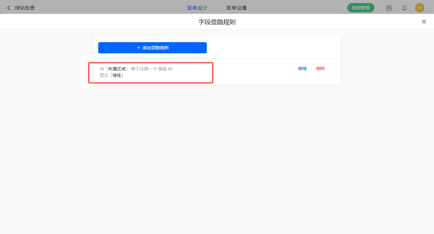 2)设置显隐规则,当【所属区域】字段等于楼栋显示【楼栋】字段;