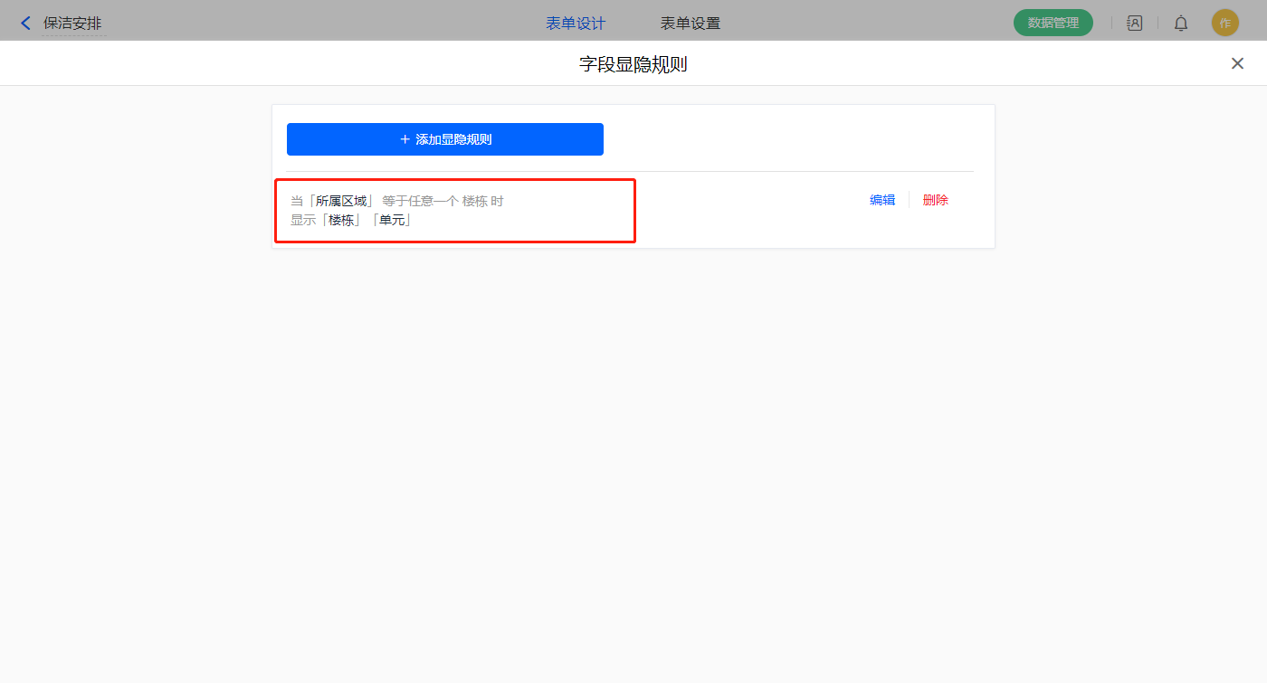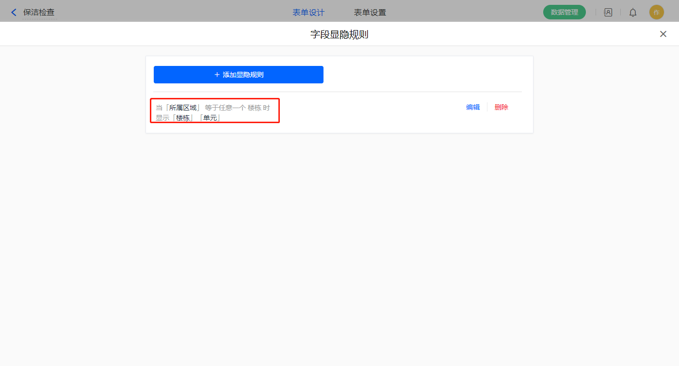 1)设置显隐规则,当【所属区域】字段等于楼栋显示【楼栋】、【单元】字段;