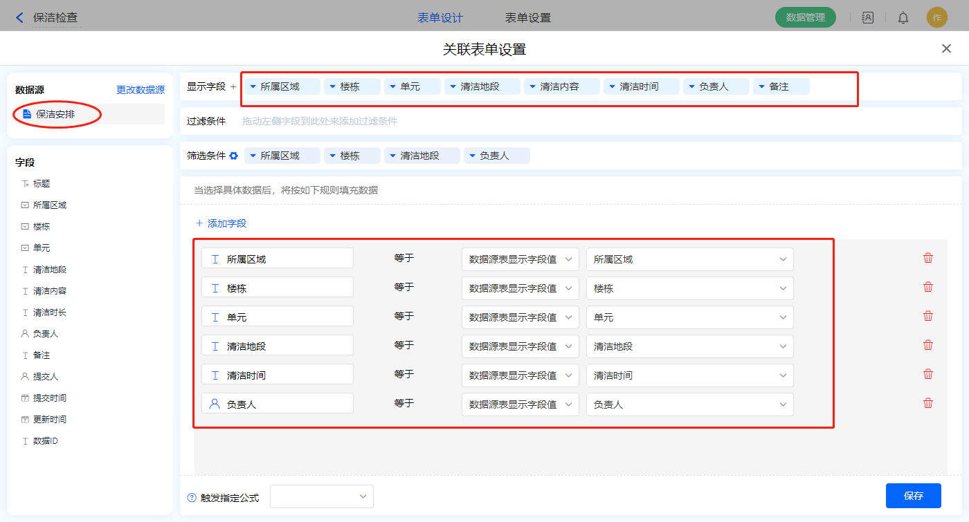 2)【保洁信息】数据加载字段,数据源为【保洁安排置】,添加过滤条件及设置赋值字段;