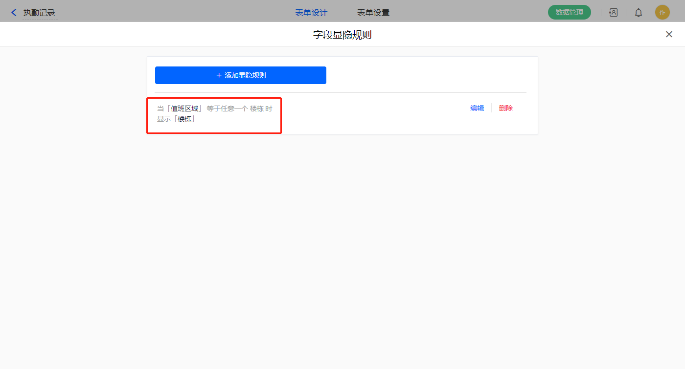 1)设置显隐规则,当【值班区域】字段等于其他显示【楼栋】字段;