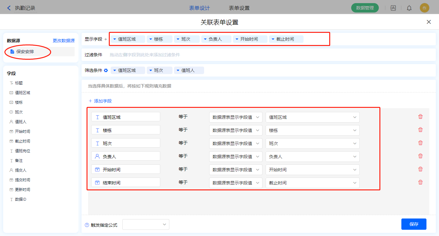 2)【安保信息】数据加载字段,数据源为【保安安排】,添加过滤条件及设置赋值字段;
