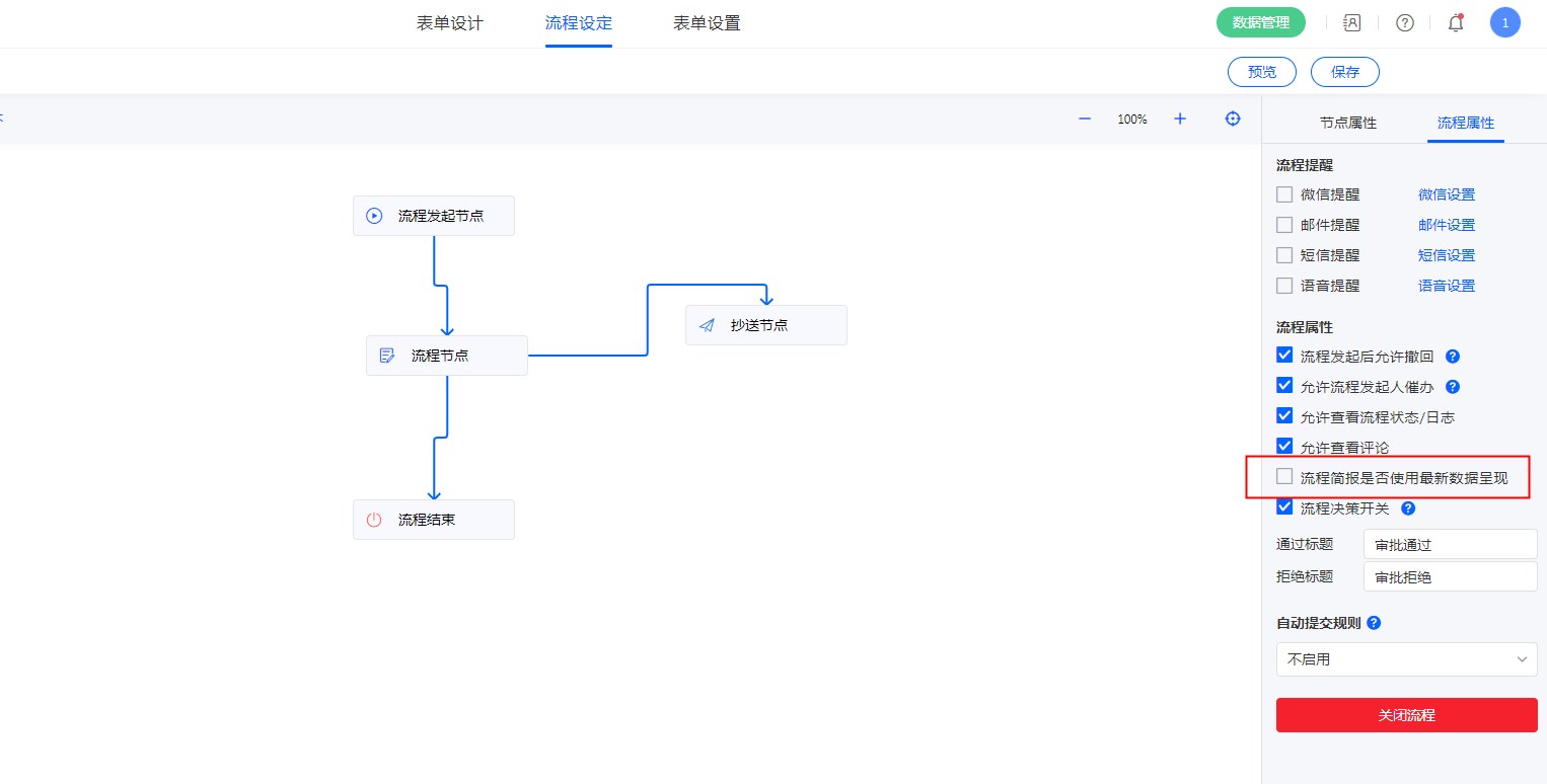 勾选【流程简报是否使用最新数据呈现】