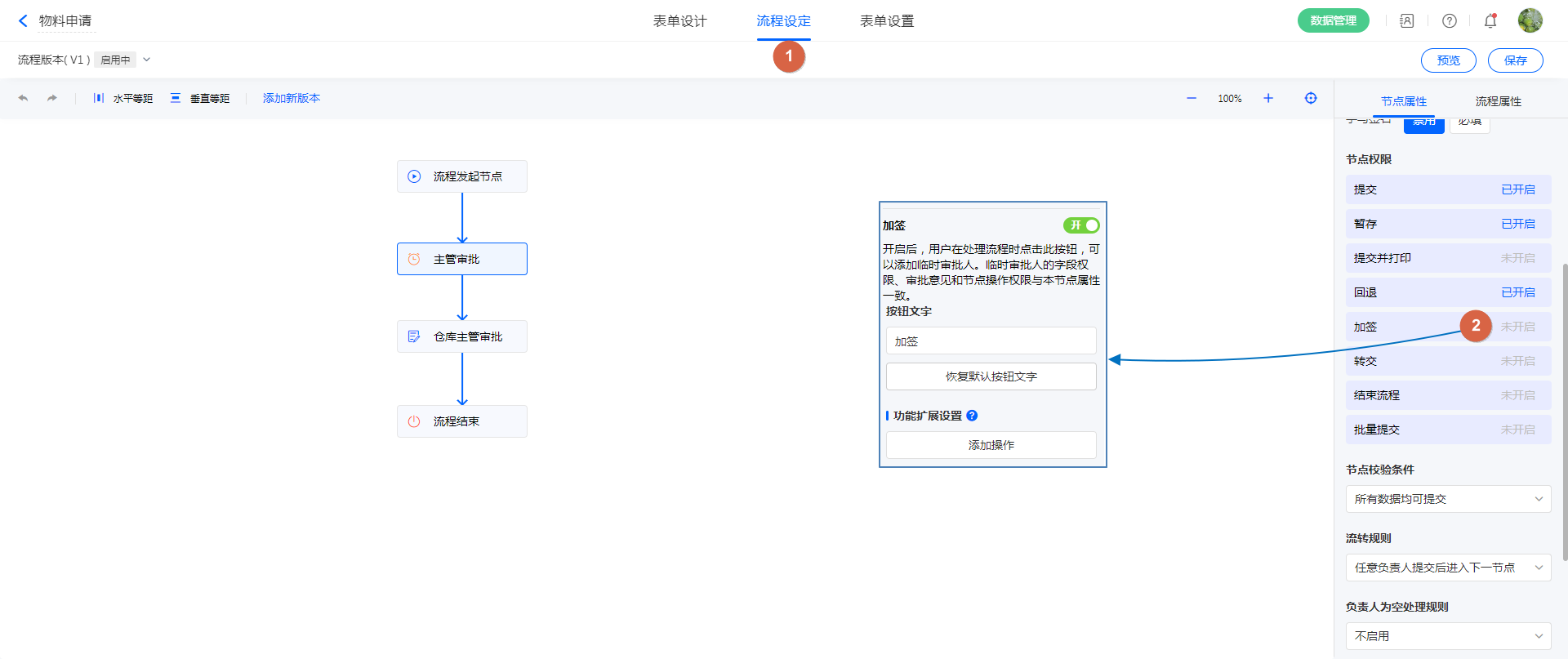 2)加签的负责人审批流程时,触发流程表单的必填、提交等校验。