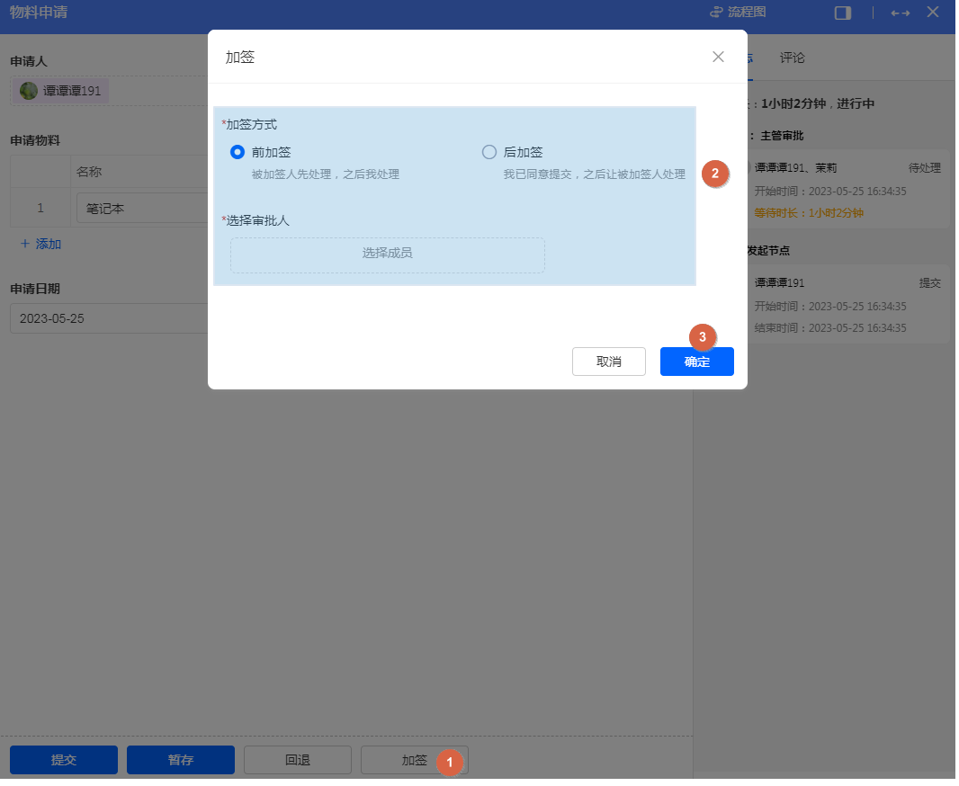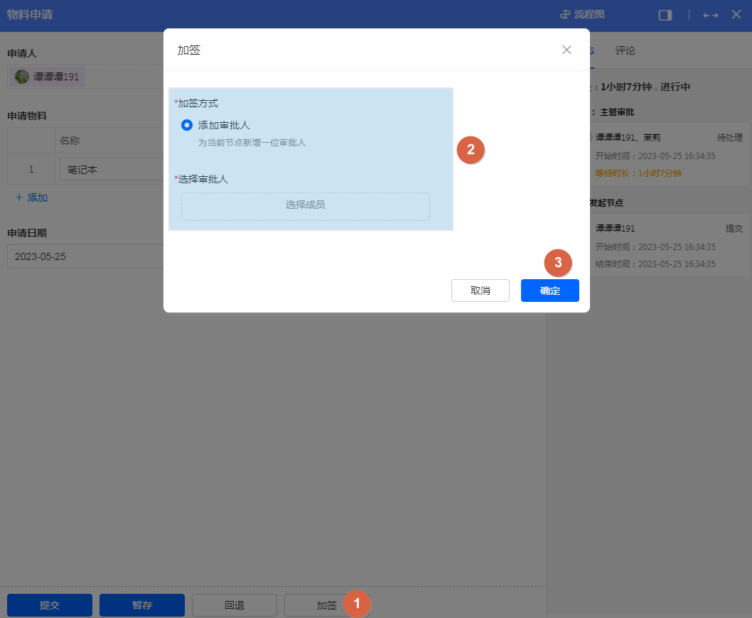 此时,可通过设置流程加签的方式添加临时审批人参与审批。