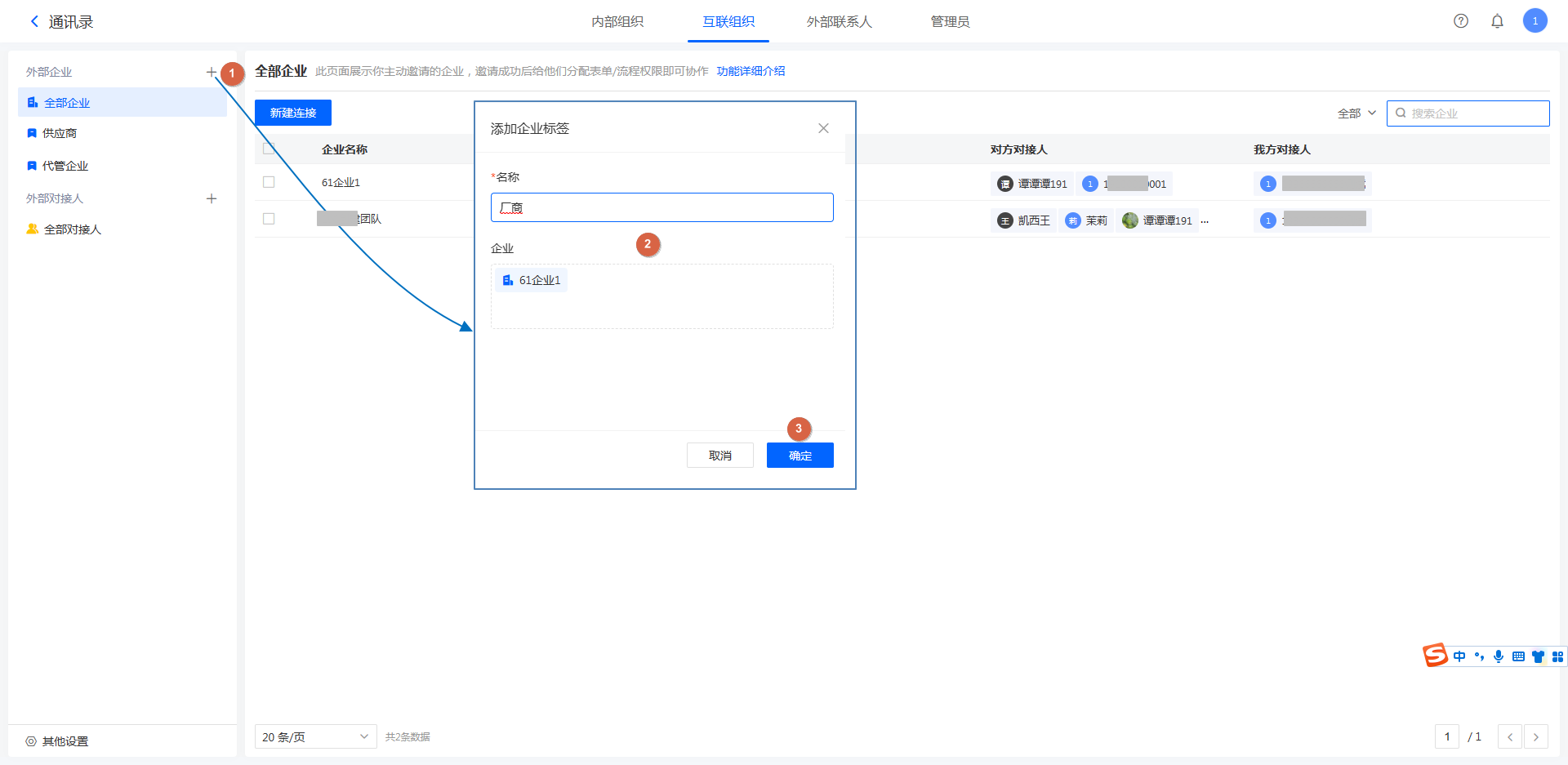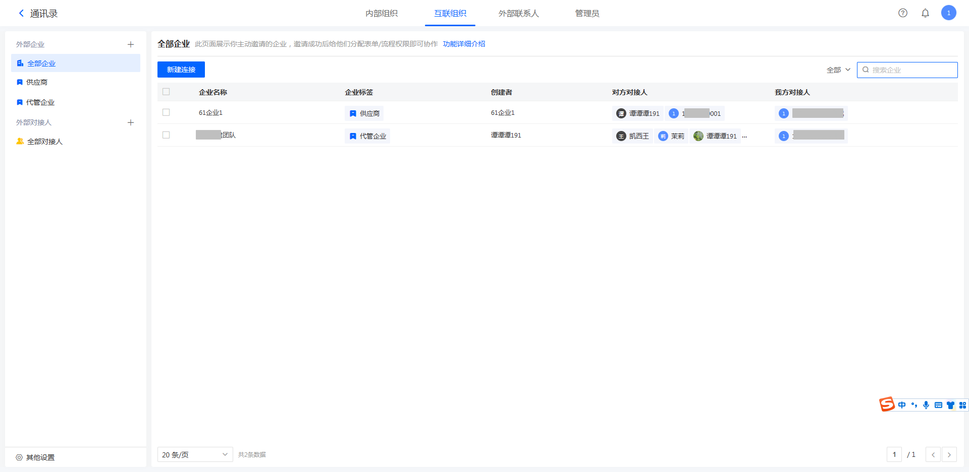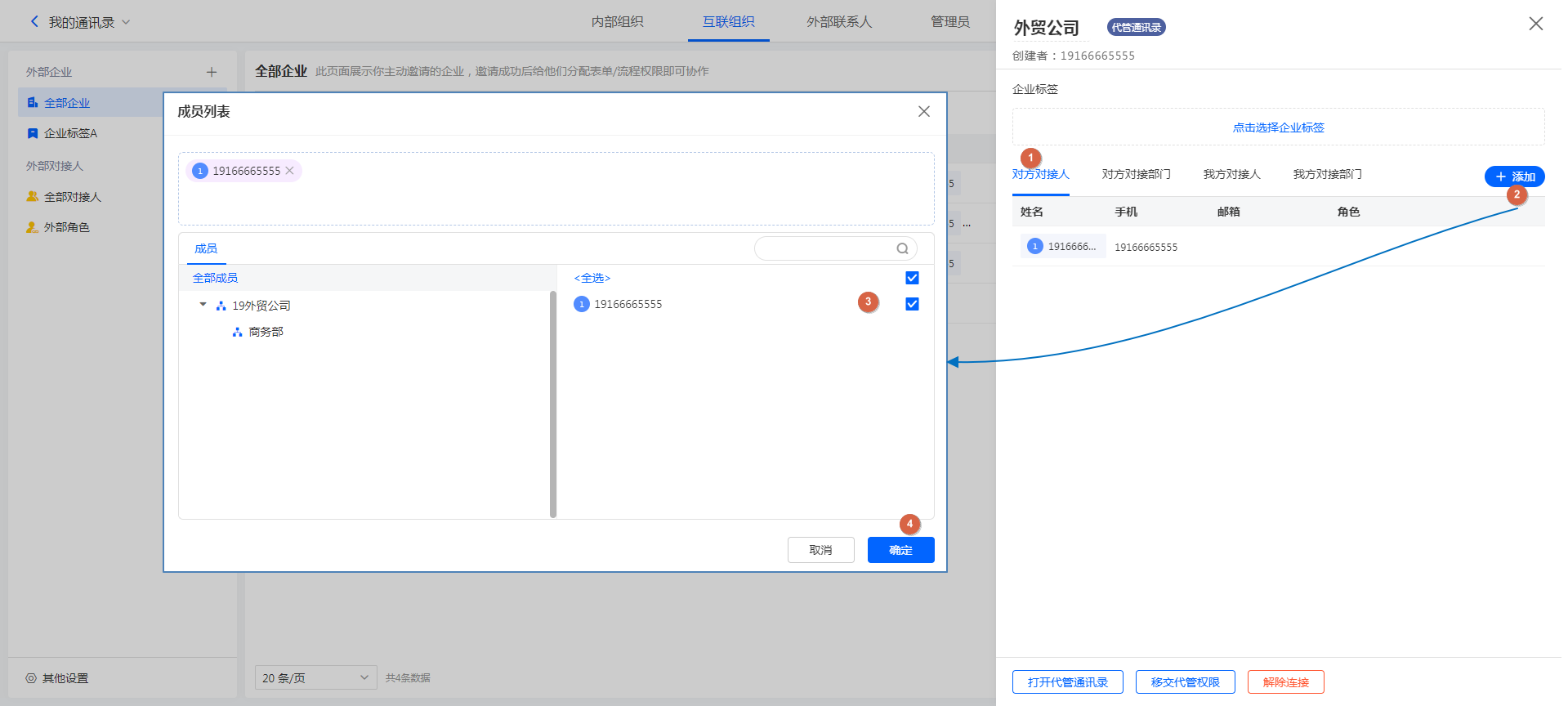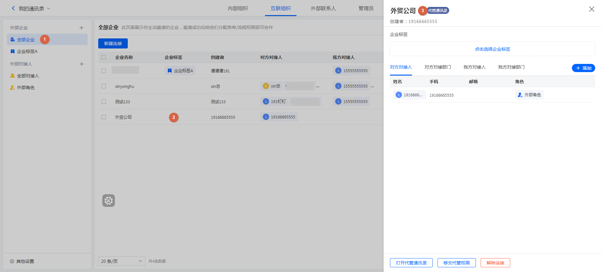 连接的企业具有通讯录代管权限的,我们称之为「代管企业」。对于代管企业,我们可以在不登录对方账号的前提下为其添加对接人。