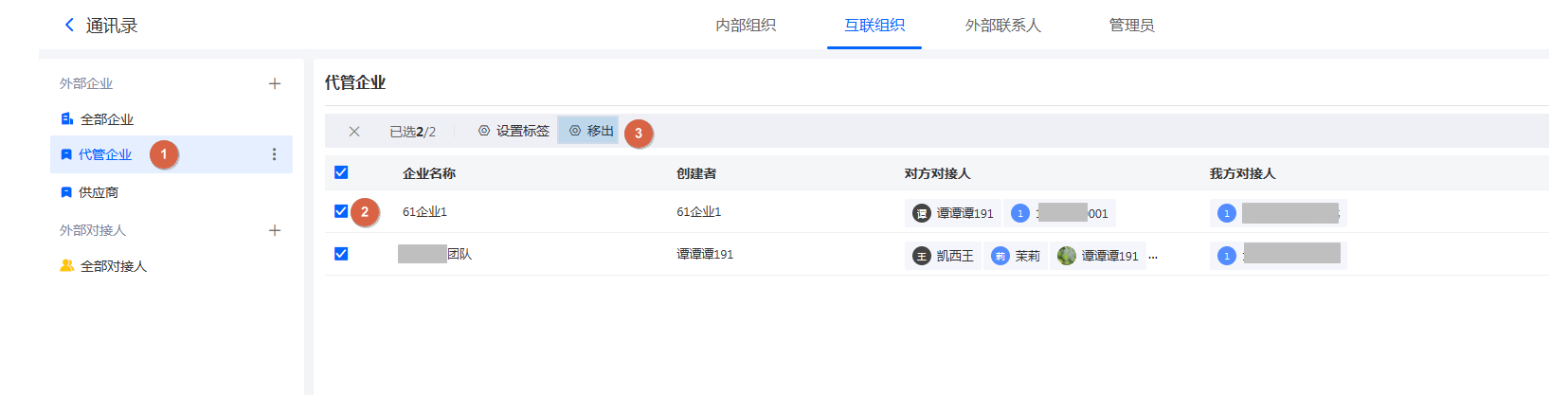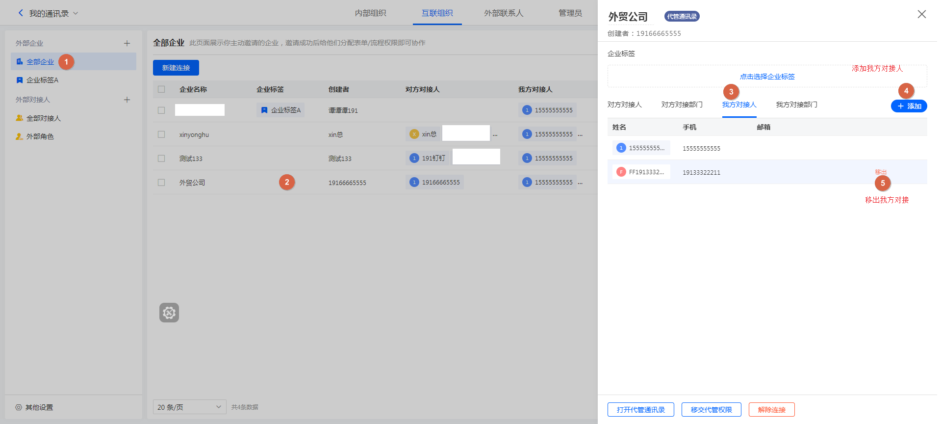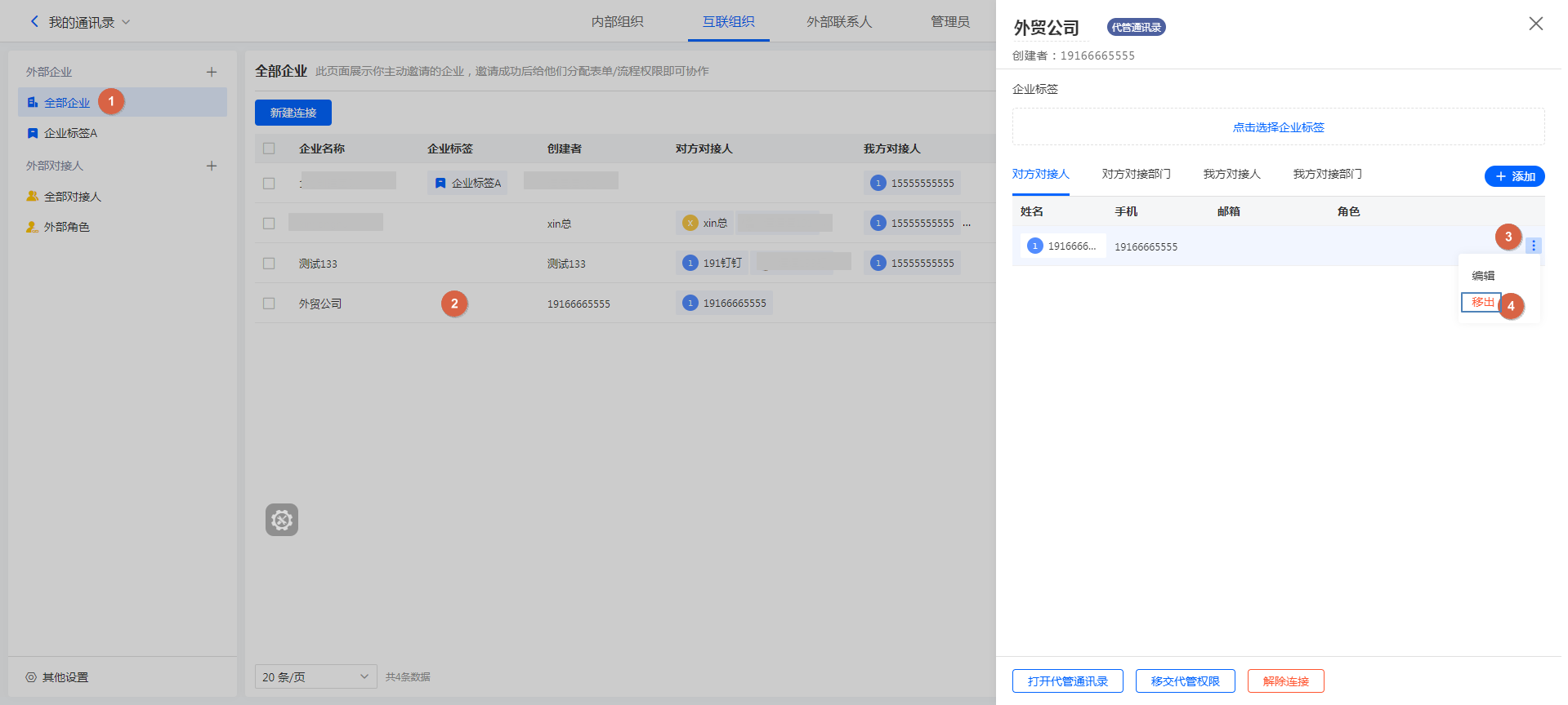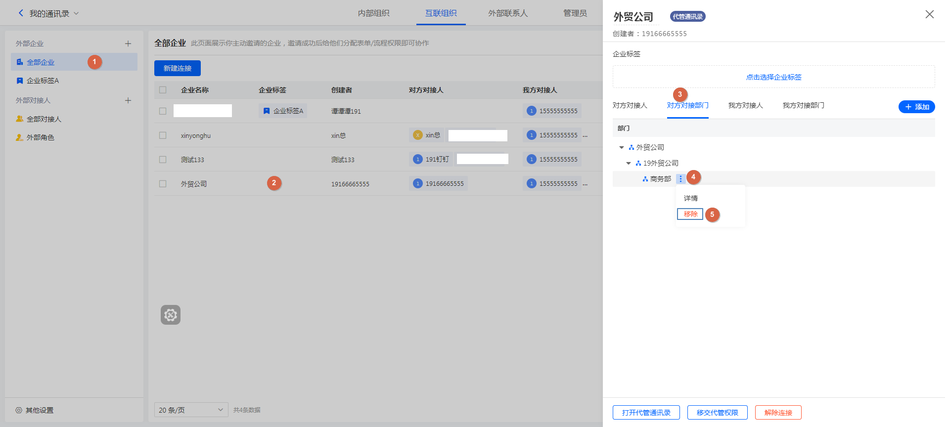 如果一个连接的企业中有多个对接人,那么可以将不需要的对接人直接移除,移除后,该对接人将无法参与我方企业的相关业务协作。