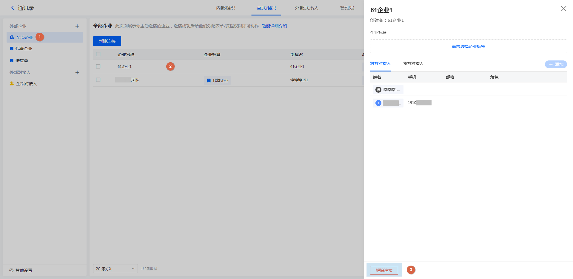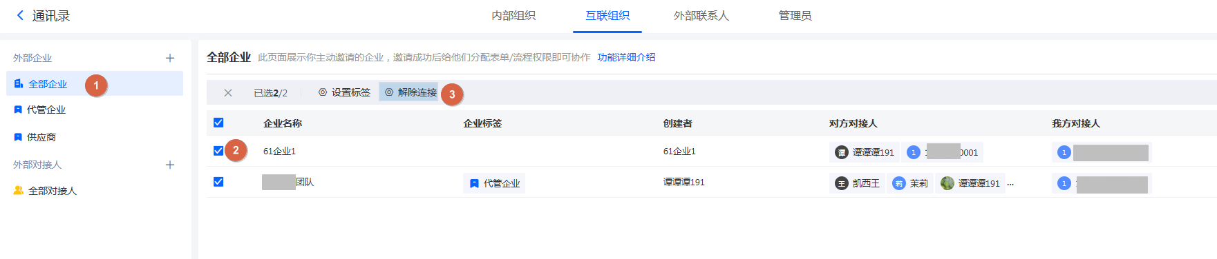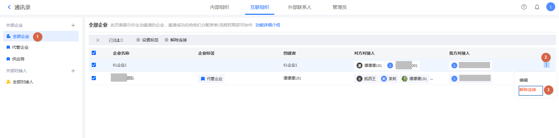 对于不需要继续建立连接的企业,可以在「全部企业」中解除连接关系。如下图所示: